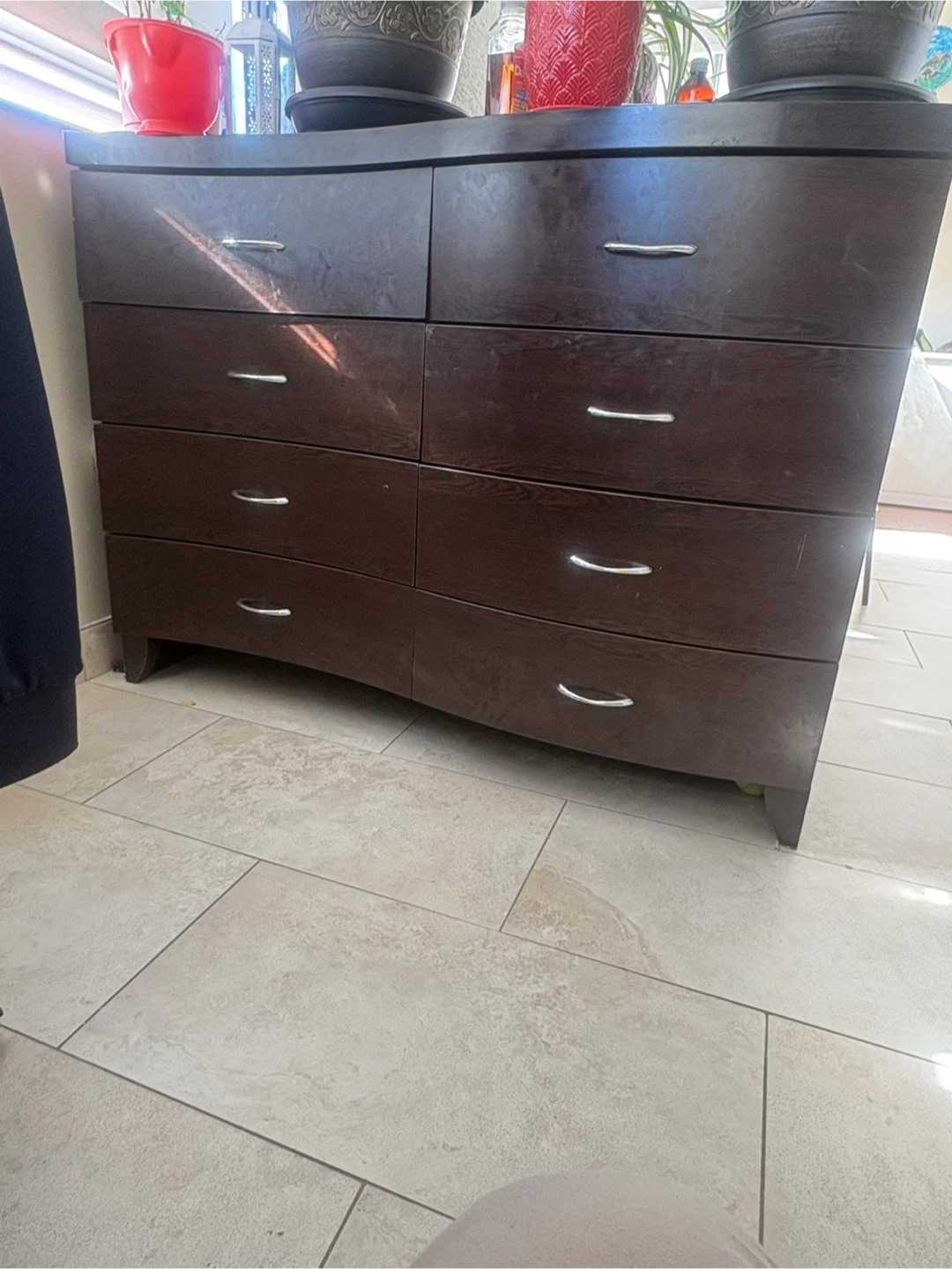 A dark brown dresser with six drawers for storage. It's made of a wood-like material with silver handles. This dresser is great for organizing clothes or linens.
