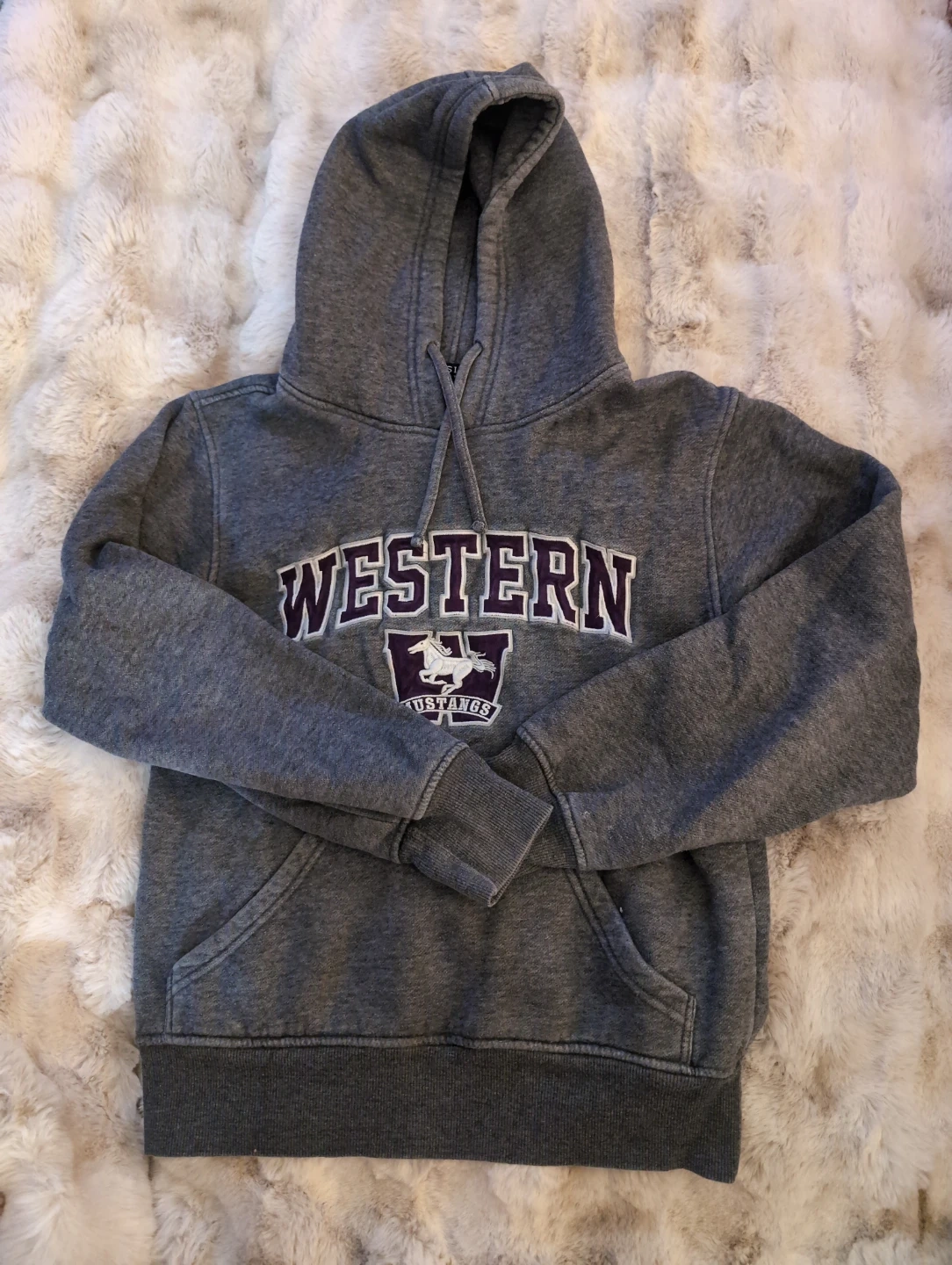 Grey hooded sweatshirt with 'Western Mustangs' graphic on the front. a comfortable pullover style with a front pocket. Cotton blend material.