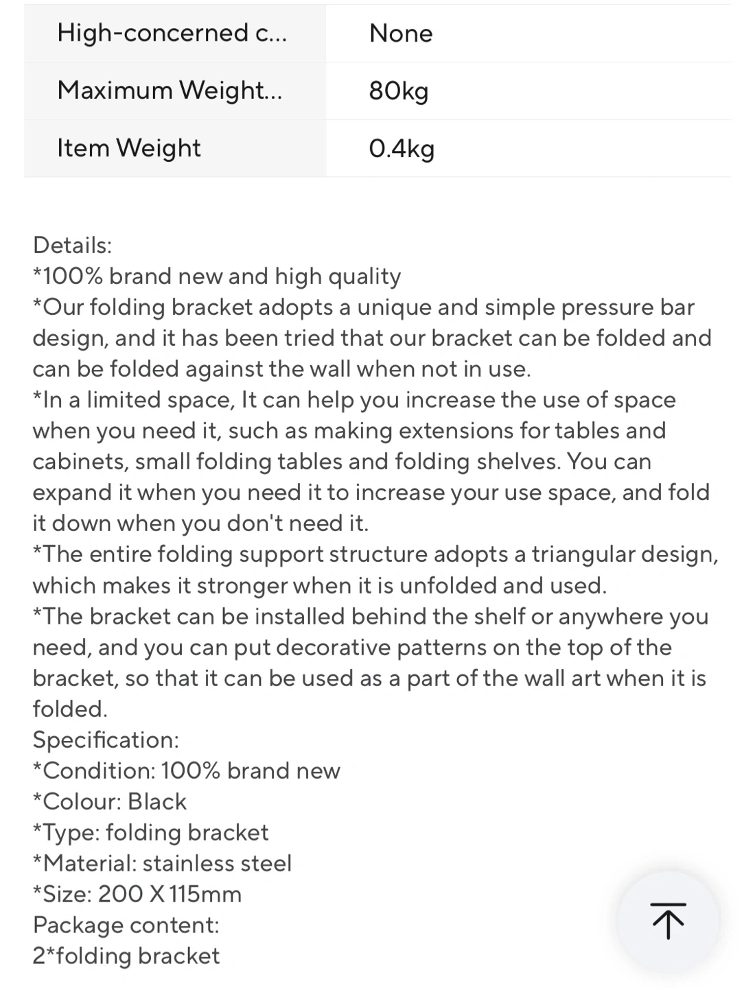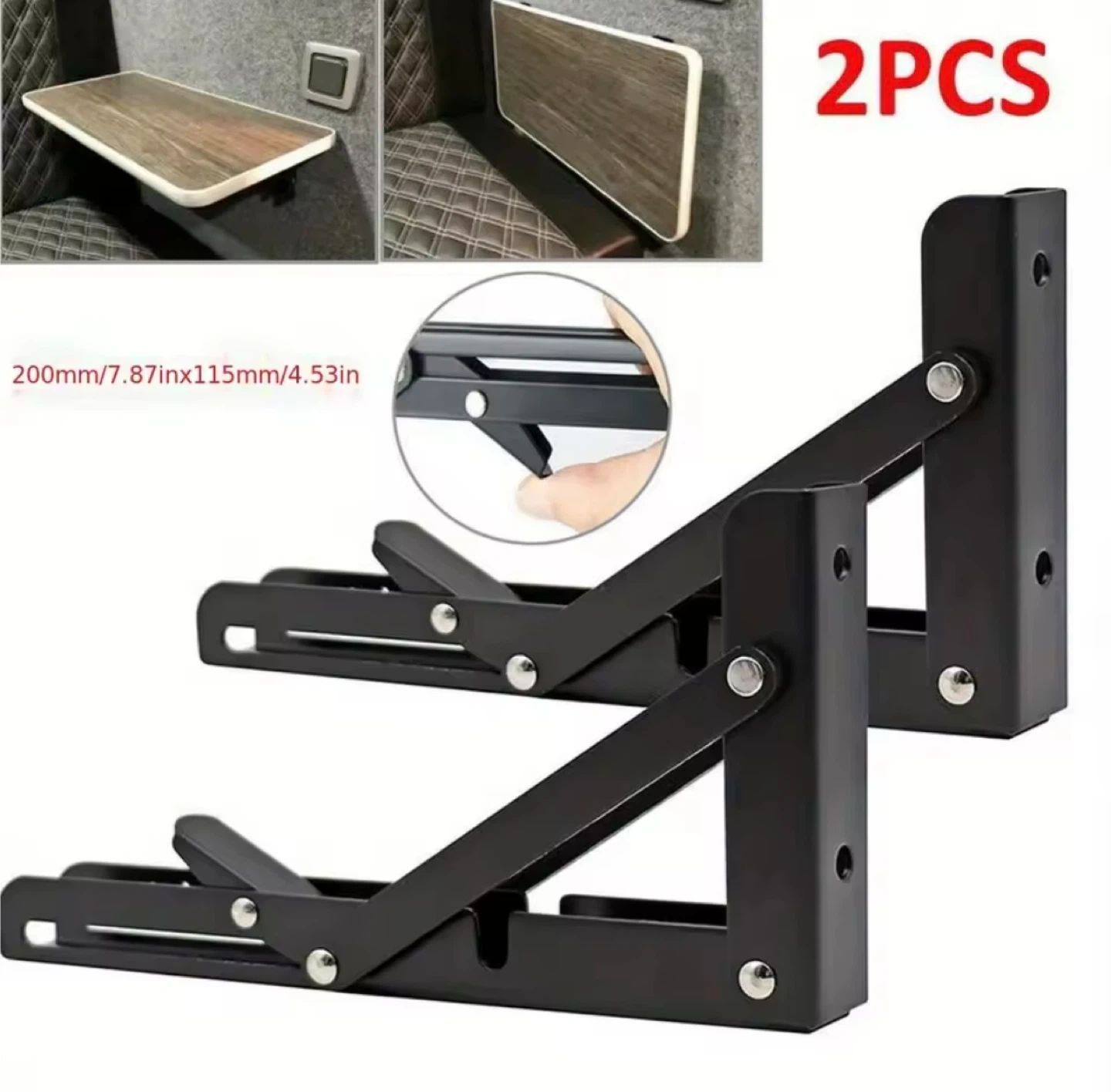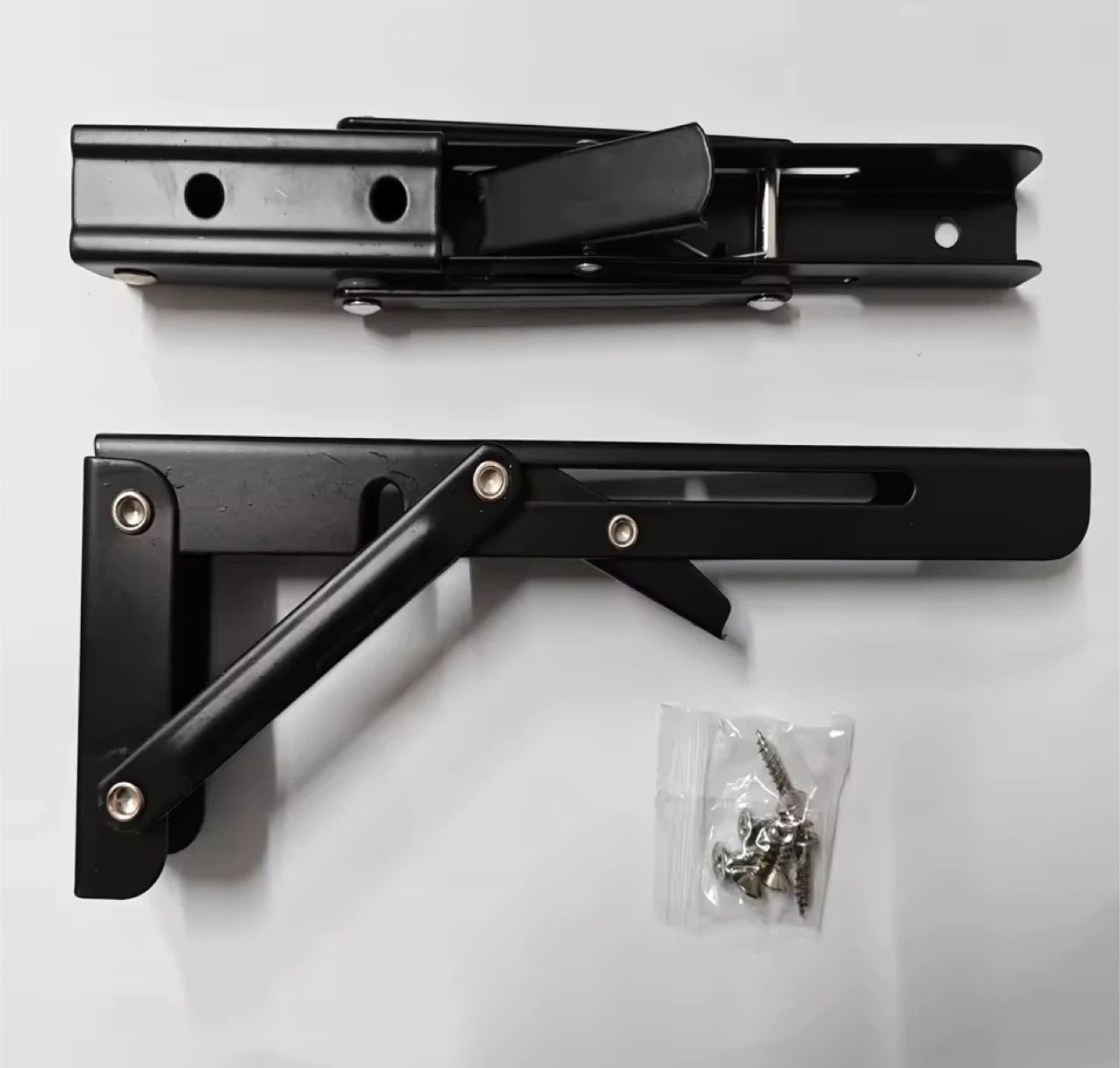 Selling a set of two folding shelf brackets! They're great for saving space and adding a little extra surface when you need it. The brackets are black and come with screws for easy installation. Each bracket measures approximately 7.87 inches by 4.53 inches.