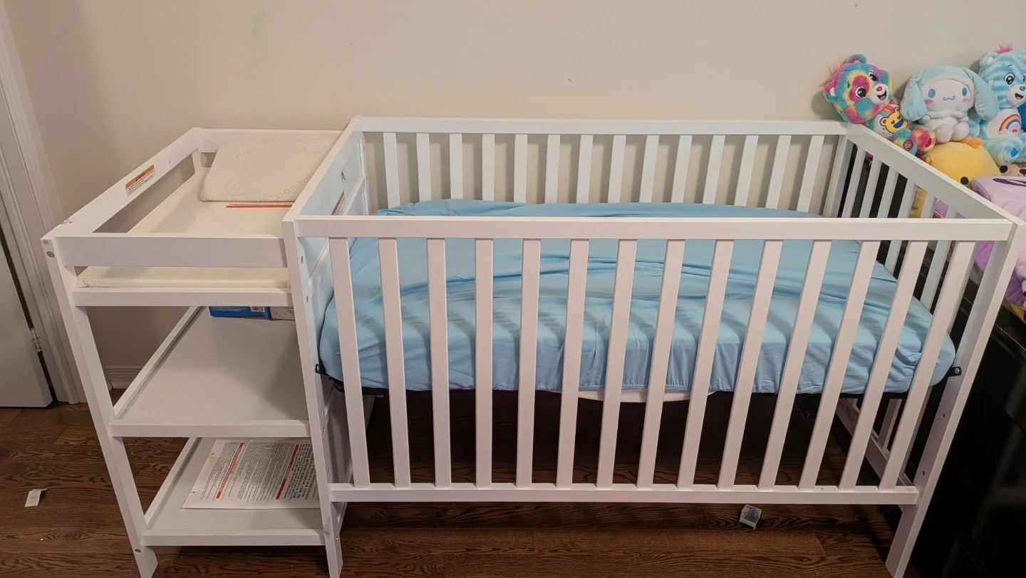 White convertible crib that includes a built-in changing station with shelves. Mattress and crib bedding are included. Suitable for a nursery.