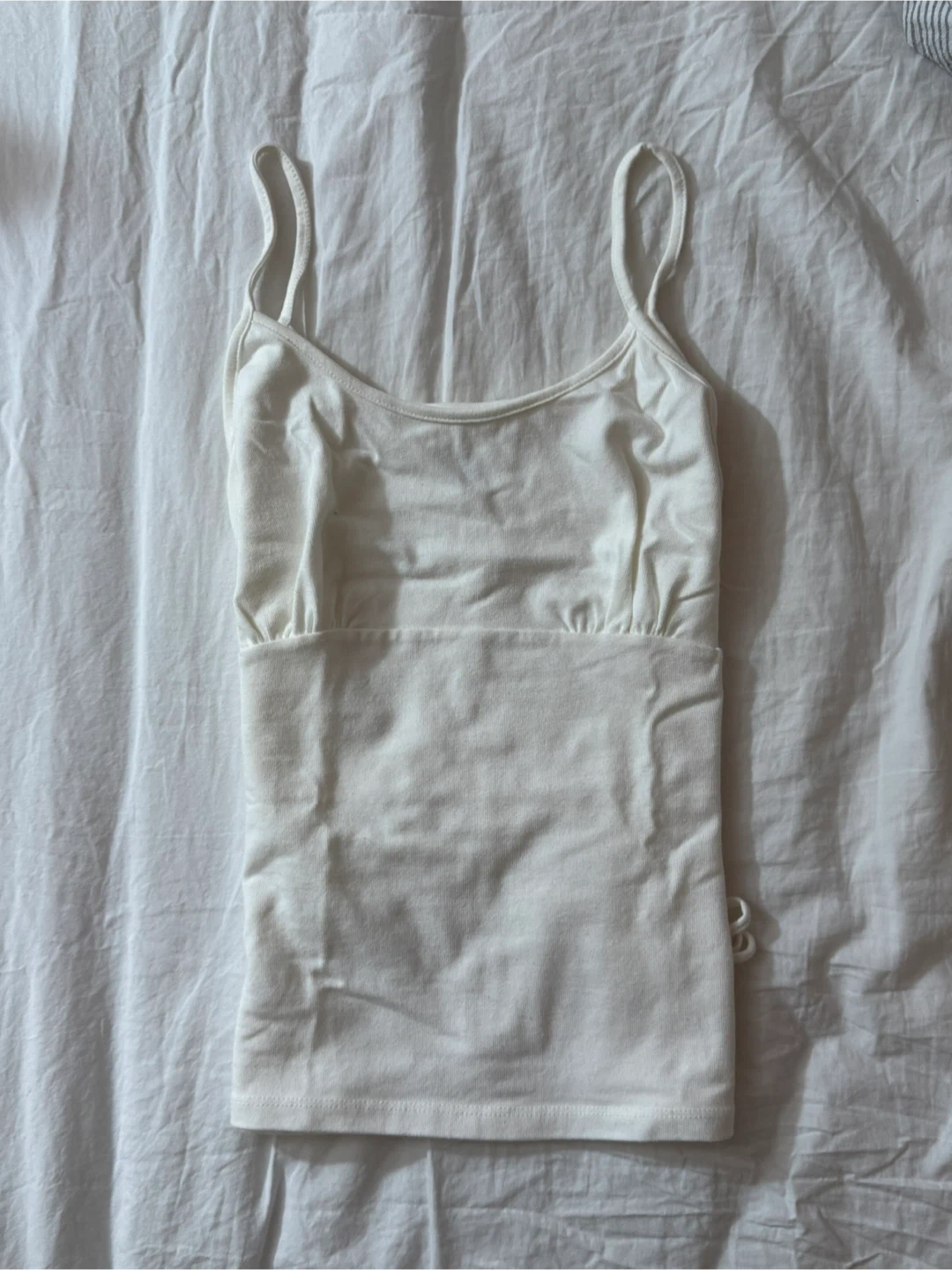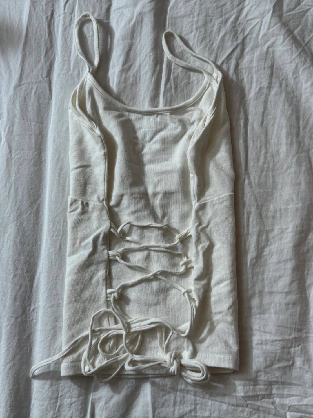 This is a white Brandy Melville tank top. It's made of 96% cotton and 4% elastane. Features a white lace-up detail on the back.