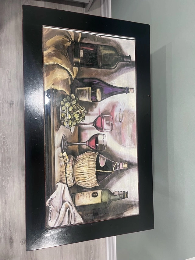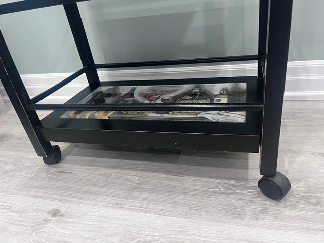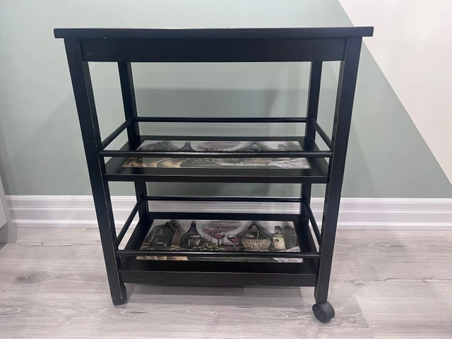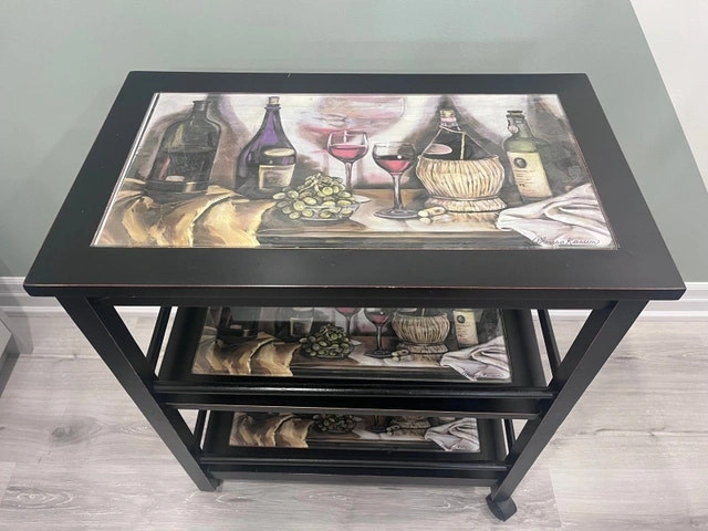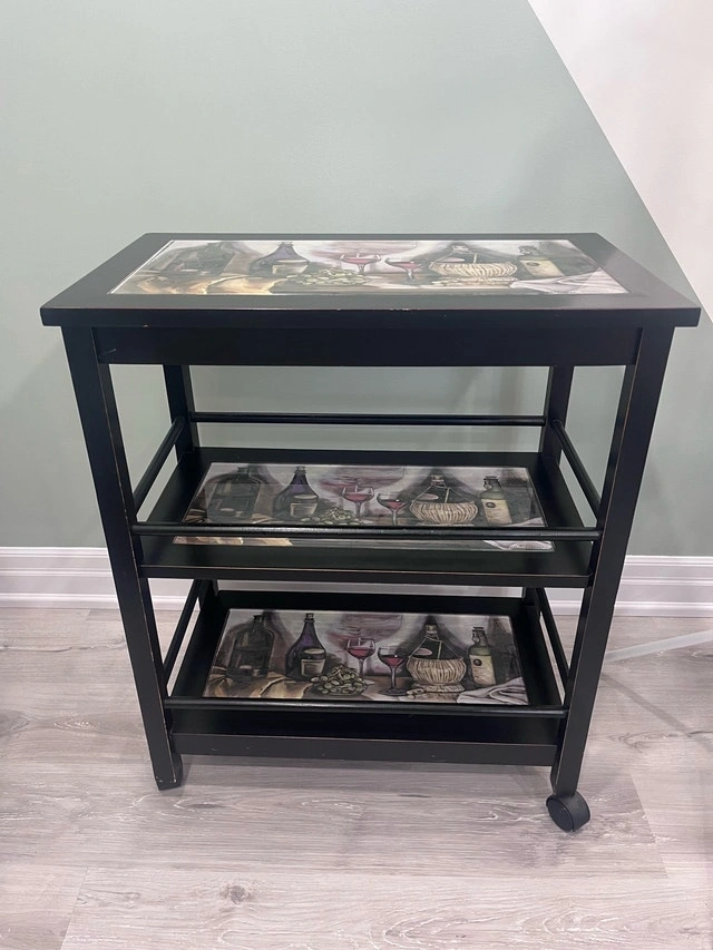 Elevate your home bar with this charming used wine cart, featuring a decorative wine-themed tile inlay on top and convenient rolling casters. This cart offers three tiers of storage, perfect for bottles, glasses, and accessories.