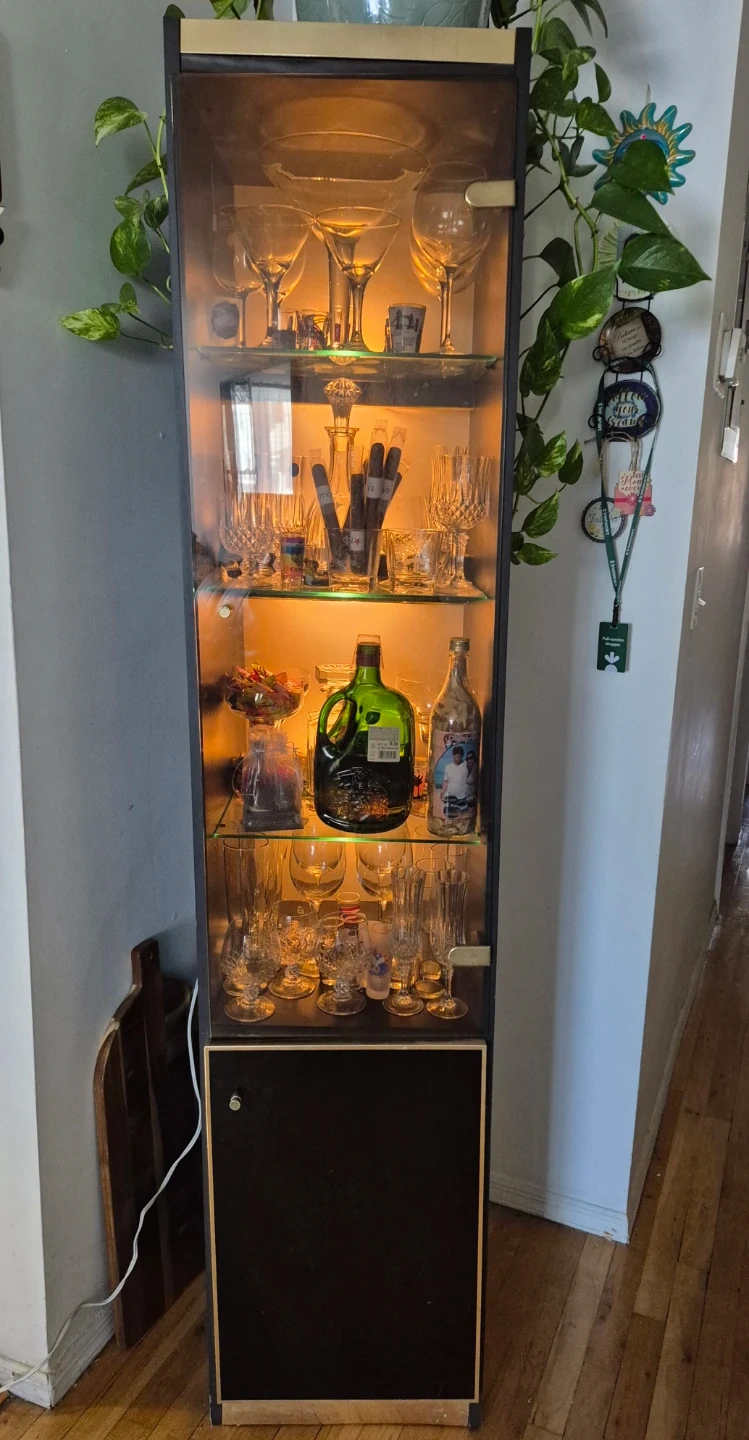 This lighted bar cabinet features glass doors and shelves showcasing various glassware and bottles. It includes a black base cabinet for storage. Perfect for displaying your drinkware collection!