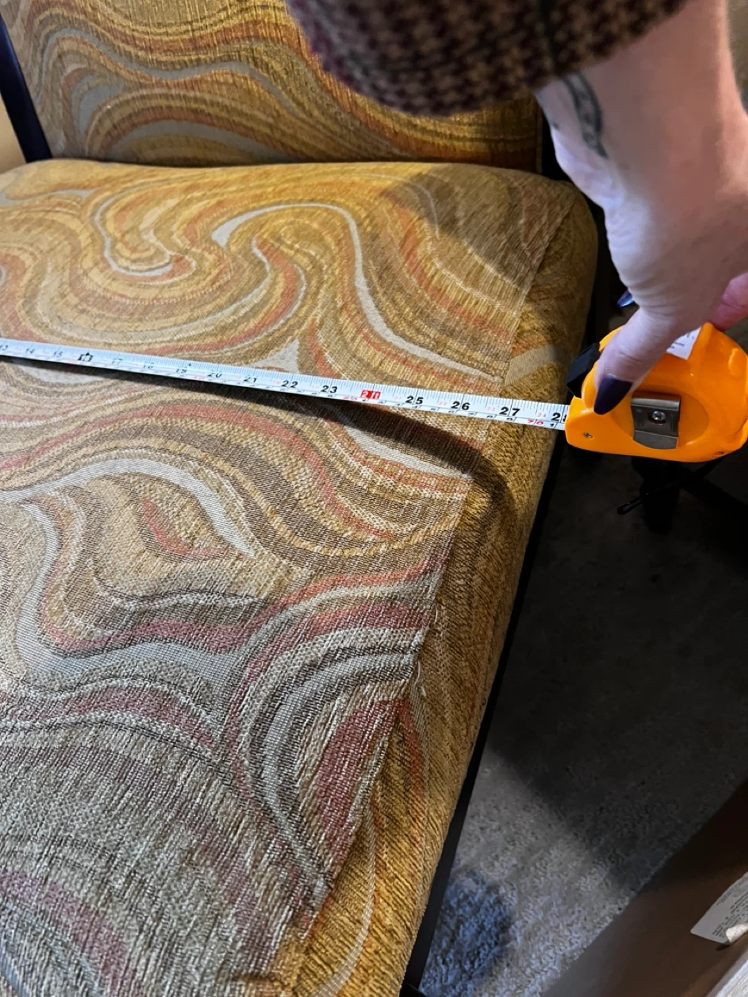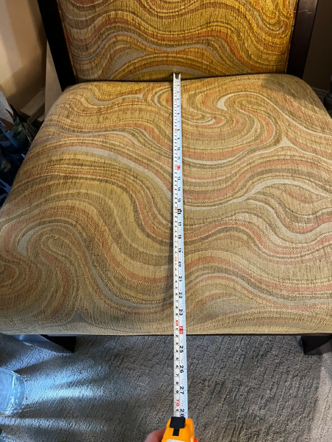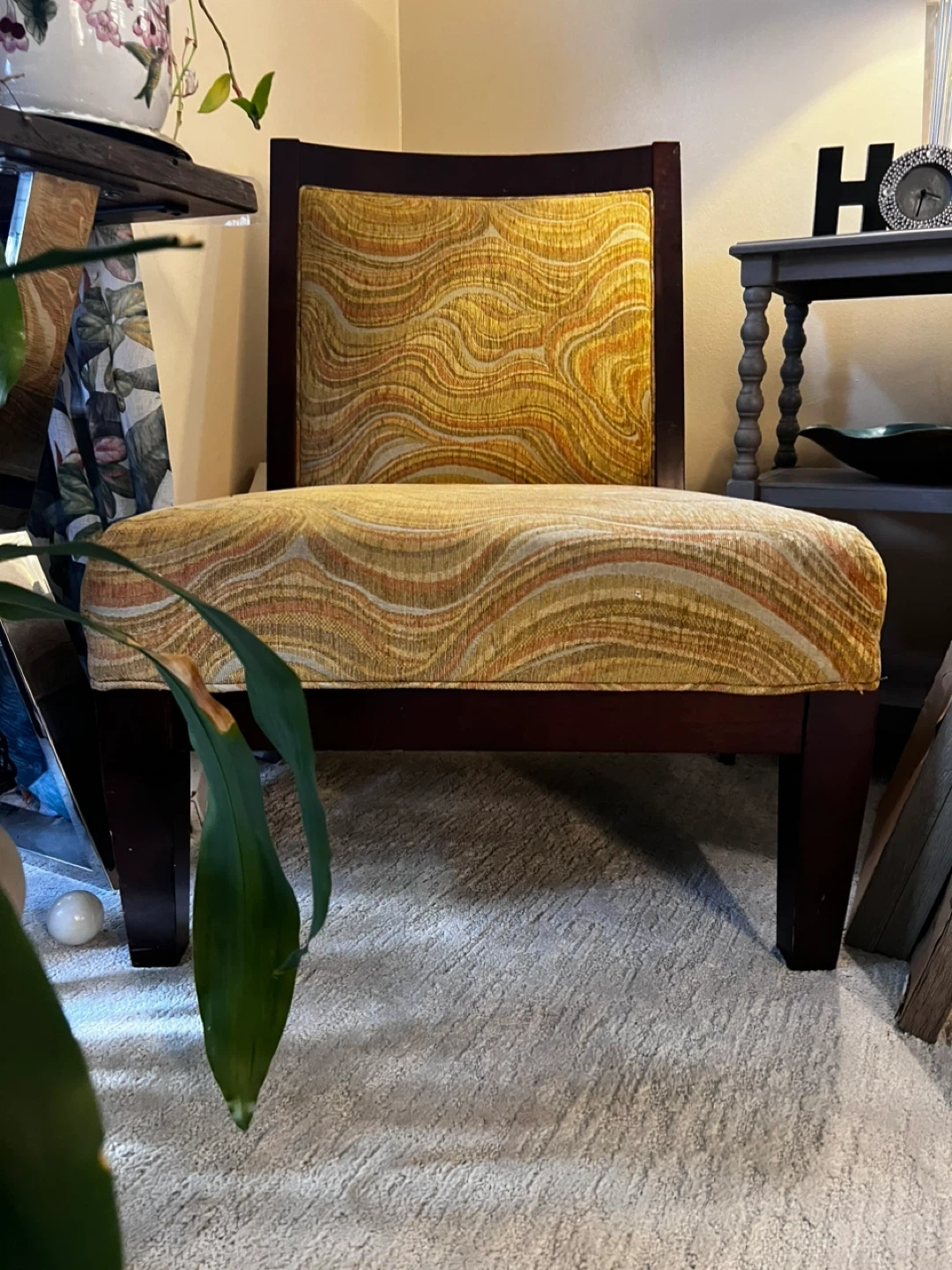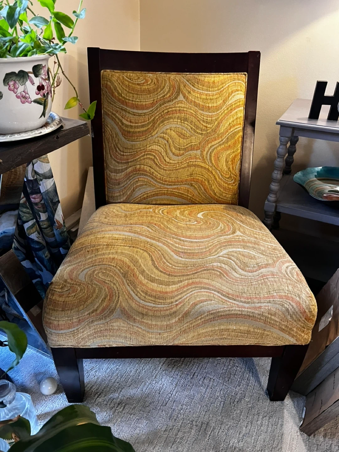15Selling a comfy upholstered accent chair! The seat is about 22 inches wide and has a unique swirl pattern in shades of gold, brown, and cream. The frame is a dark wood. It's in good condition and would look great in any room!