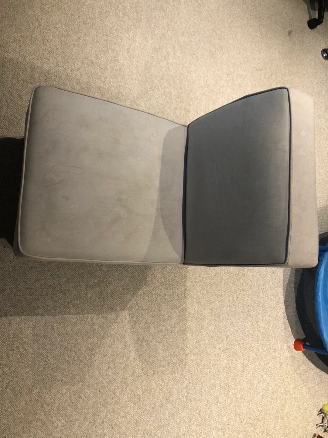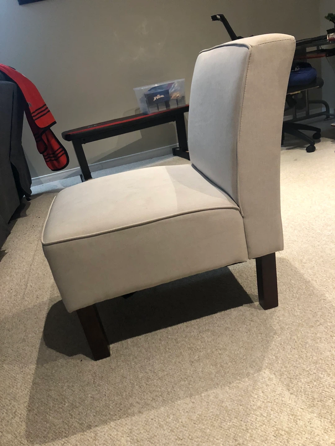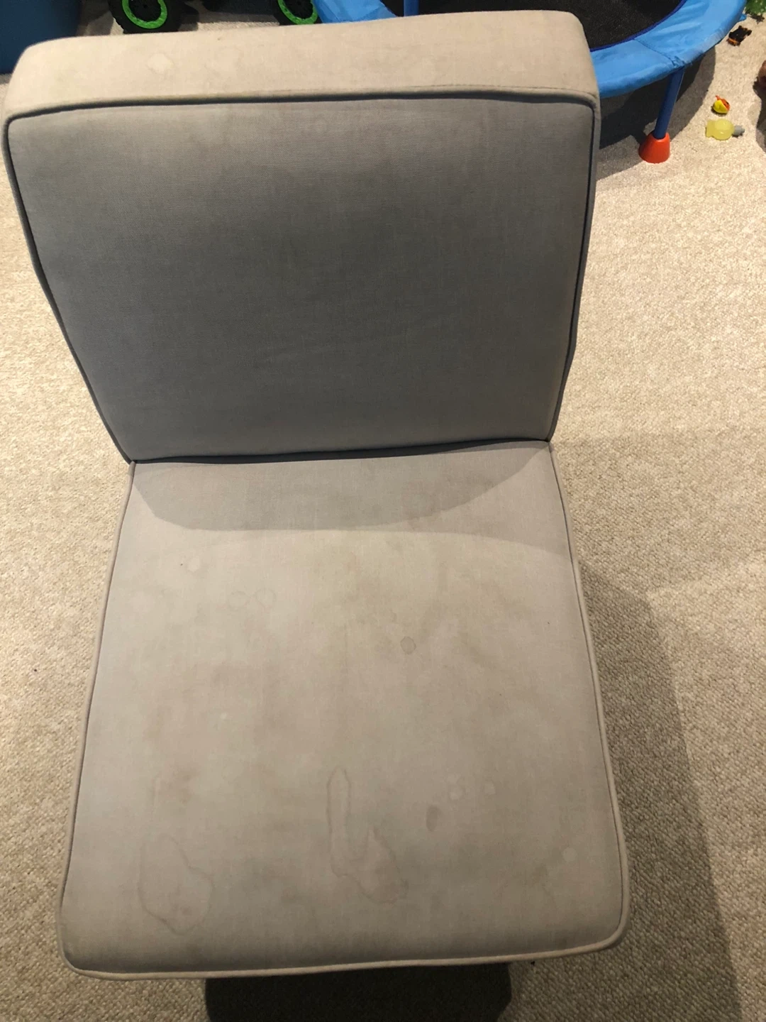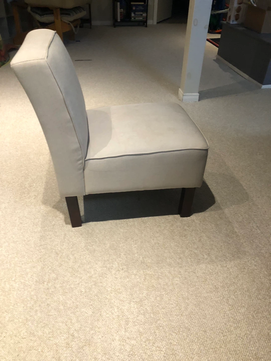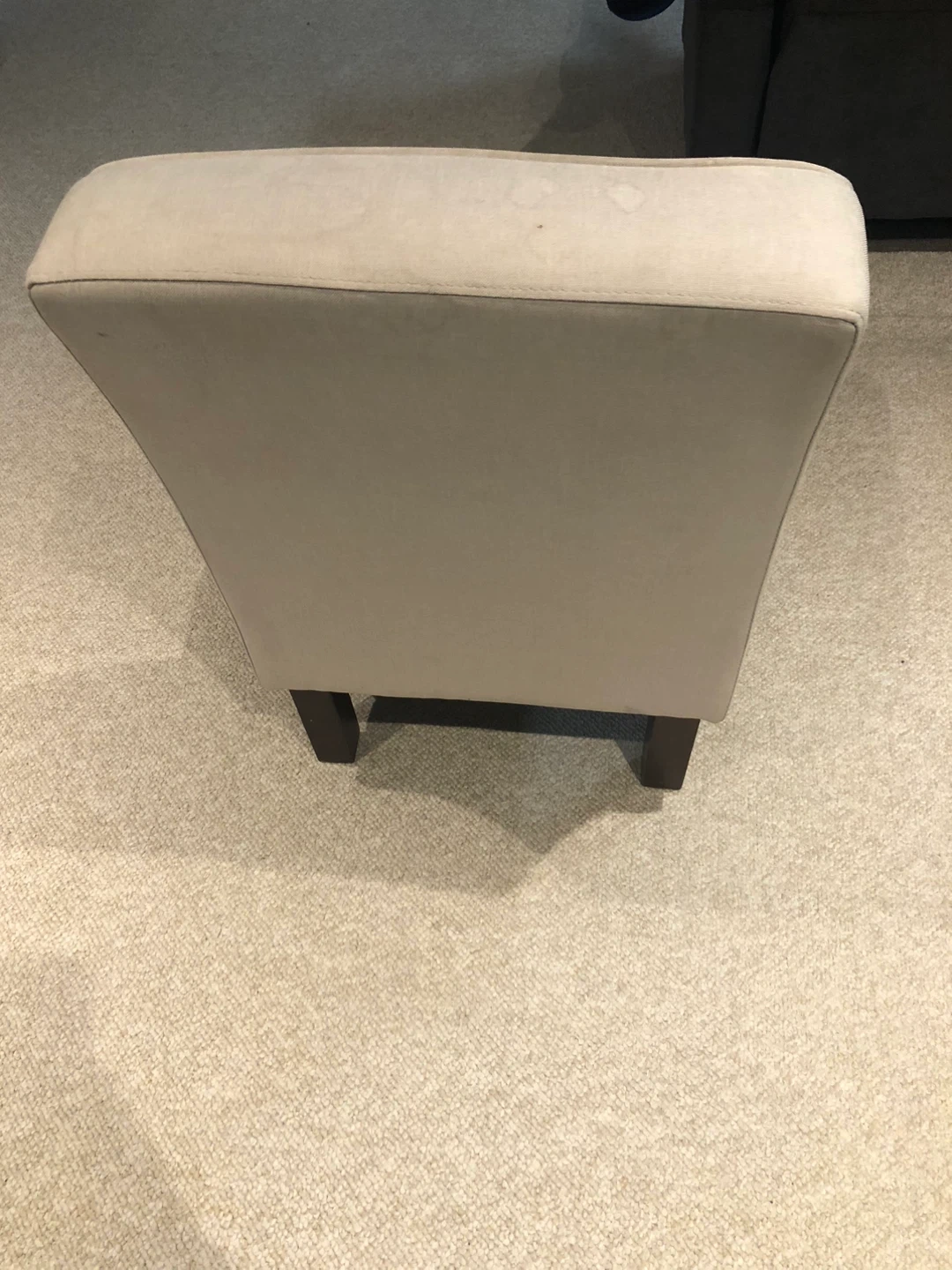 Selling a beige upholstered accent chair. It's in good condition and would be great for a living room or bedroom. The chair has dark brown legs and a comfortable seat. There are some water stains on the seat.