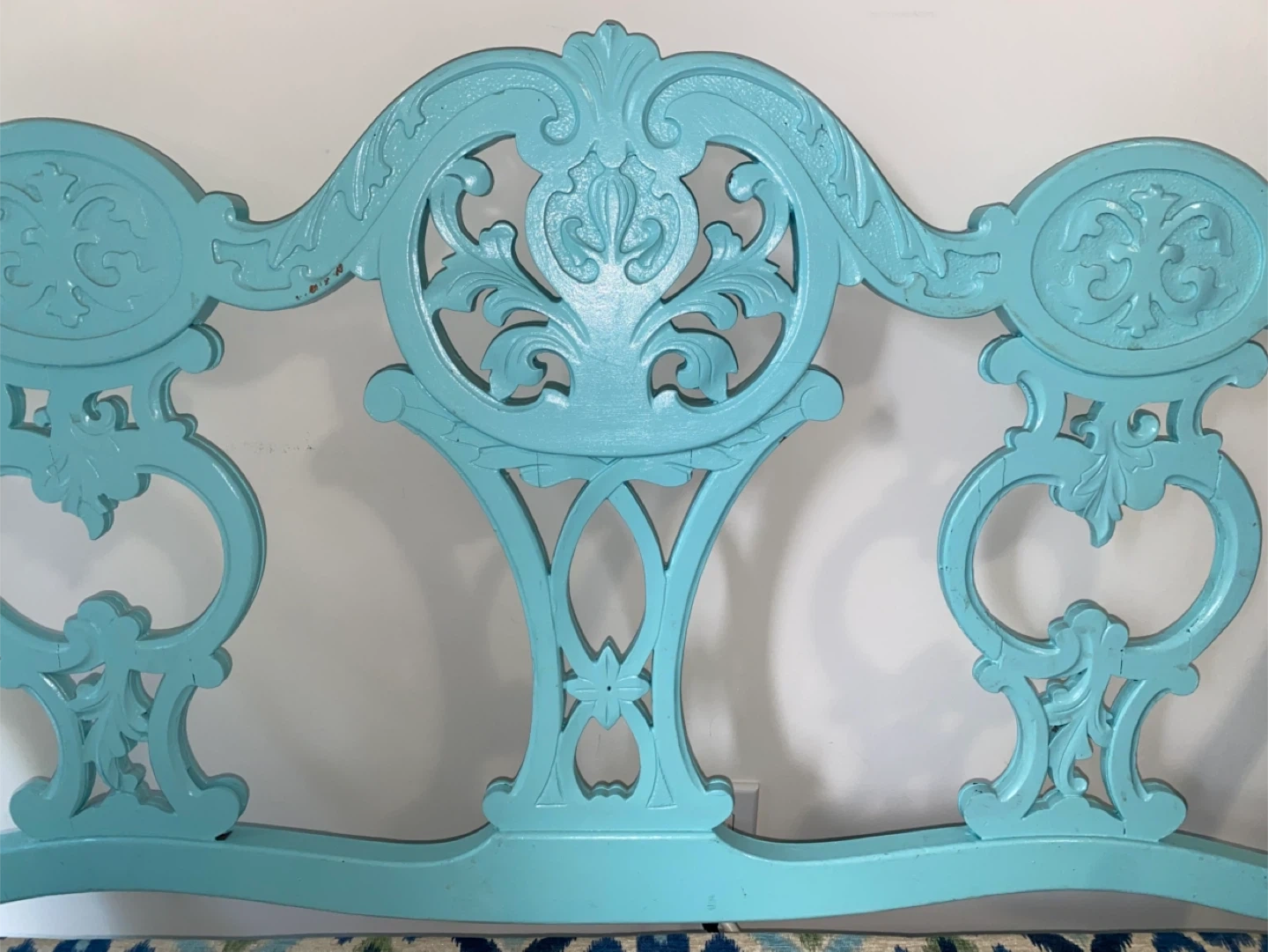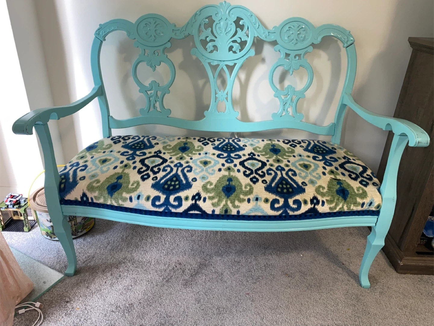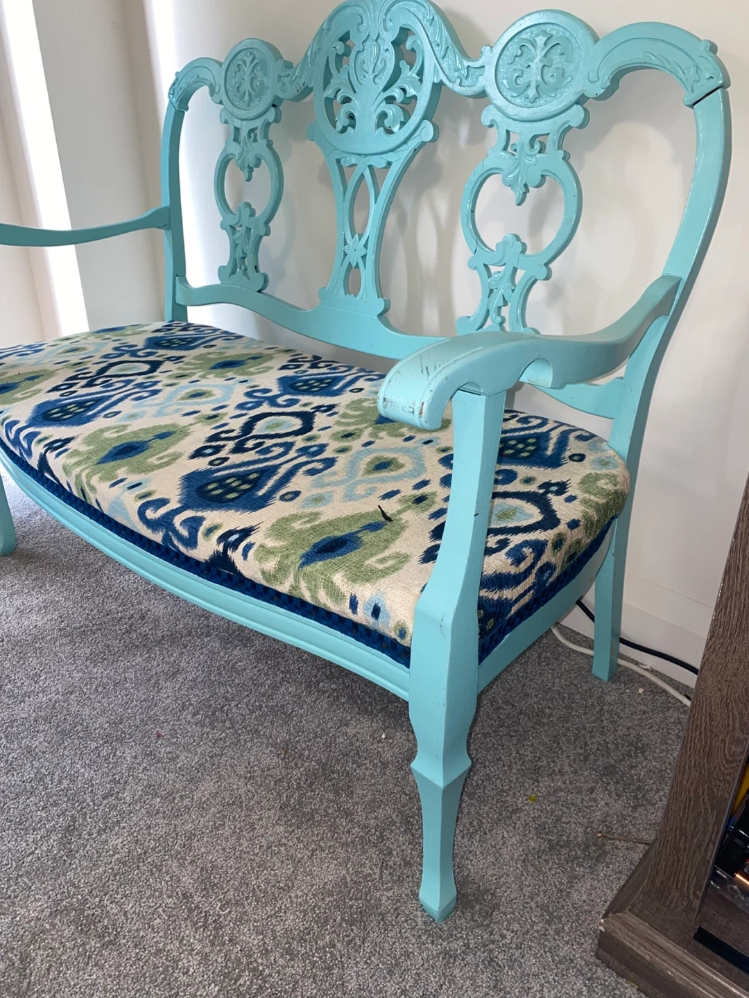 Selling a charming turquoise loveseat bench! It features a beautifully patterned cushion in shades of blue, green, and cream. The frame has a lovely ornate design. It's a unique piece to add a touch of vintage flair to your home