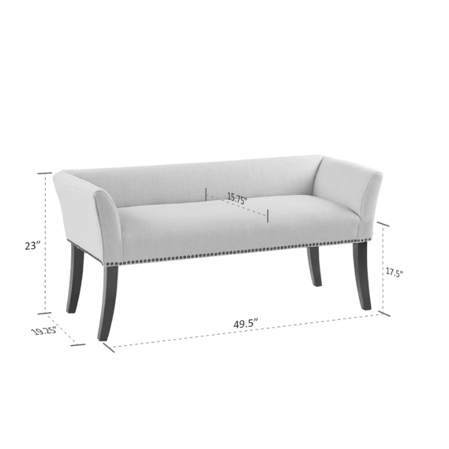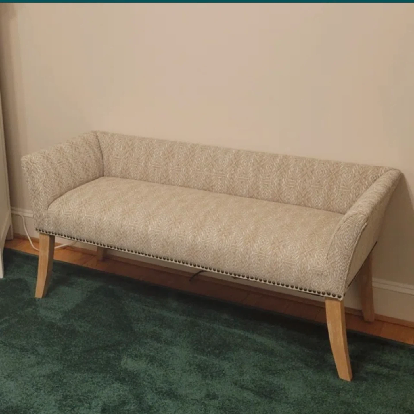 Selling a comfy upholstered settee bench! It's perfect for adding a touch of elegance to any room. The dimensions are: - Length: 49.5" - Height: 23" - Seat Height: 17.5" - Leg Depth: 19.25" - Backrest Height: 15.75"