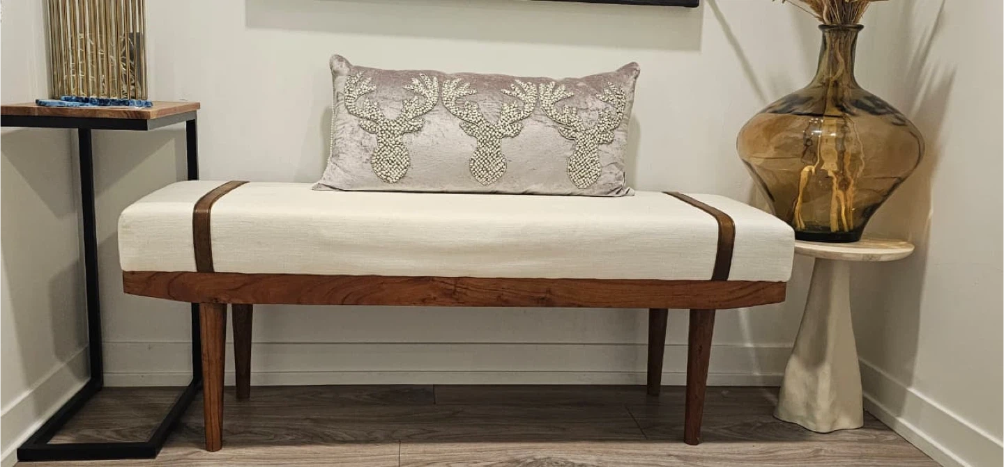 Here's a lovely upholstered bench with a sturdy wooden frame! It's in great shape and would look fantastic in an entryway or living room. The neutral upholstery makes it easy to match with any decor. It's a stylish and functional piece of furniture that's ready for a new home
