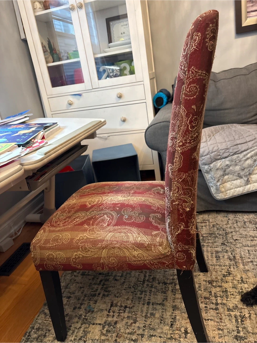 Selling a lovely upholstered dining chair! It features a red and gold paisley pattern. The chair has dark wooden legs and would look great in any dining room or as an accent piece.