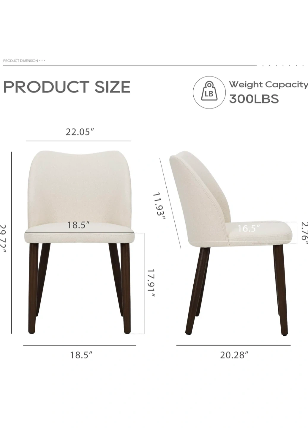 This upholstered dining chair features a durable rubberwood frame and an anti-slip protector. It has a weight capacity of 300lbs. The chair's dimensions are approximately 29.72" in height, 18.5" in width, and 20.28" in depth, with a seat height of 17.91".