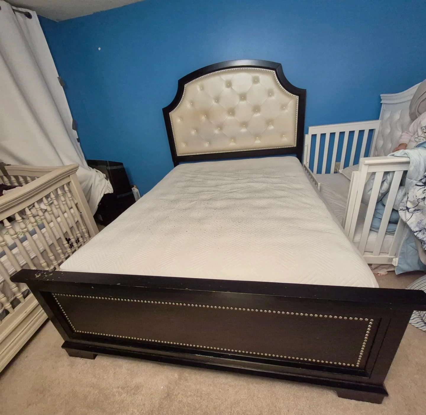 10Selling a bed frame with a dark wood finish and upholstered headboard. It's in good condition and has a stylish, classic look. Perfect for adding a touch of elegance to any bedroom!