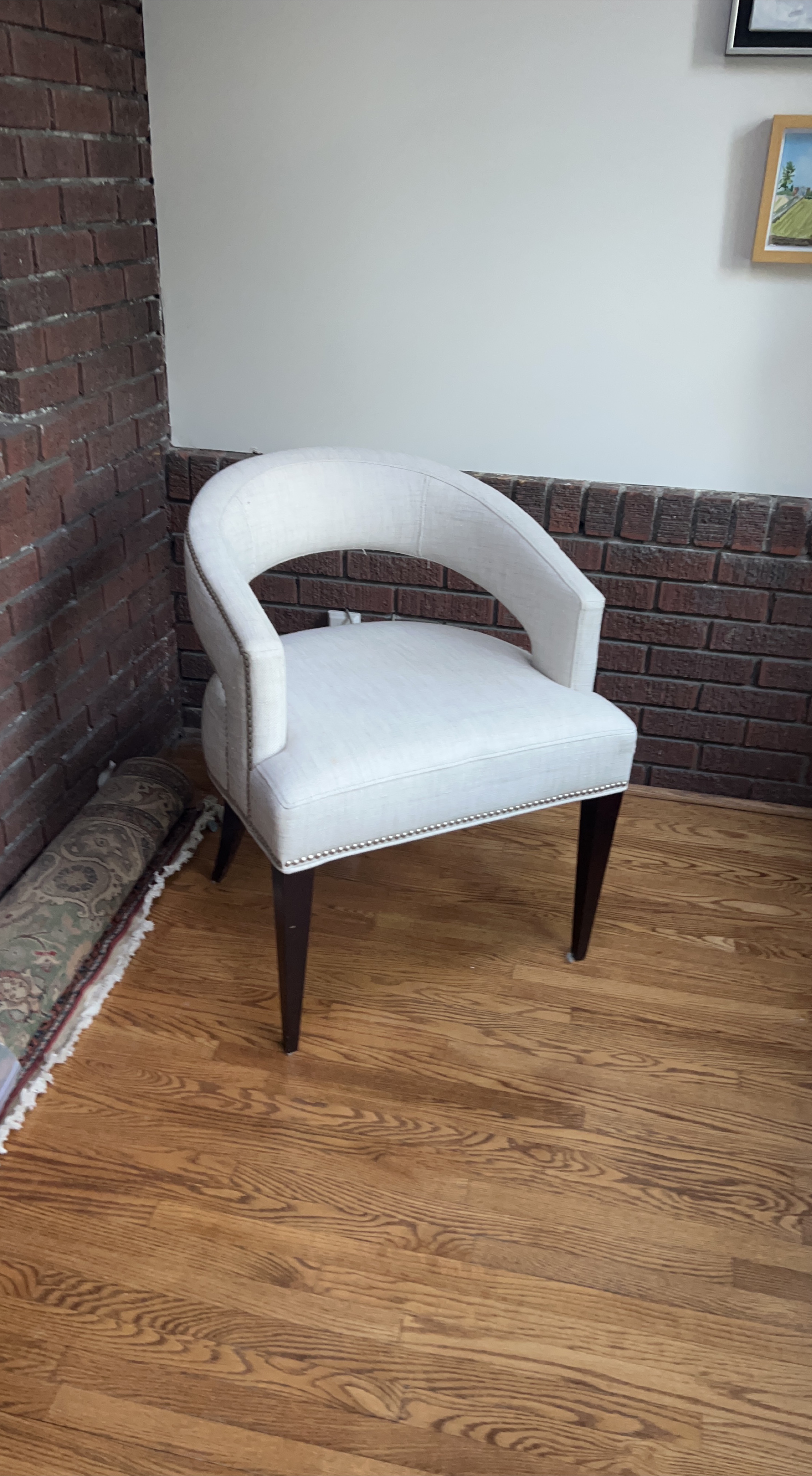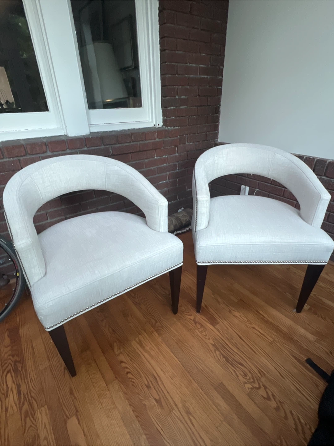 Selling a lovely pair of upholstered accent chair! This has been made custom. It's in great condition and would look fantastic in any living room or bedroom. The chair is a cream colour with dark wood legs, and features nailhead trim. Perfect for adding a touch of elegance to your home!