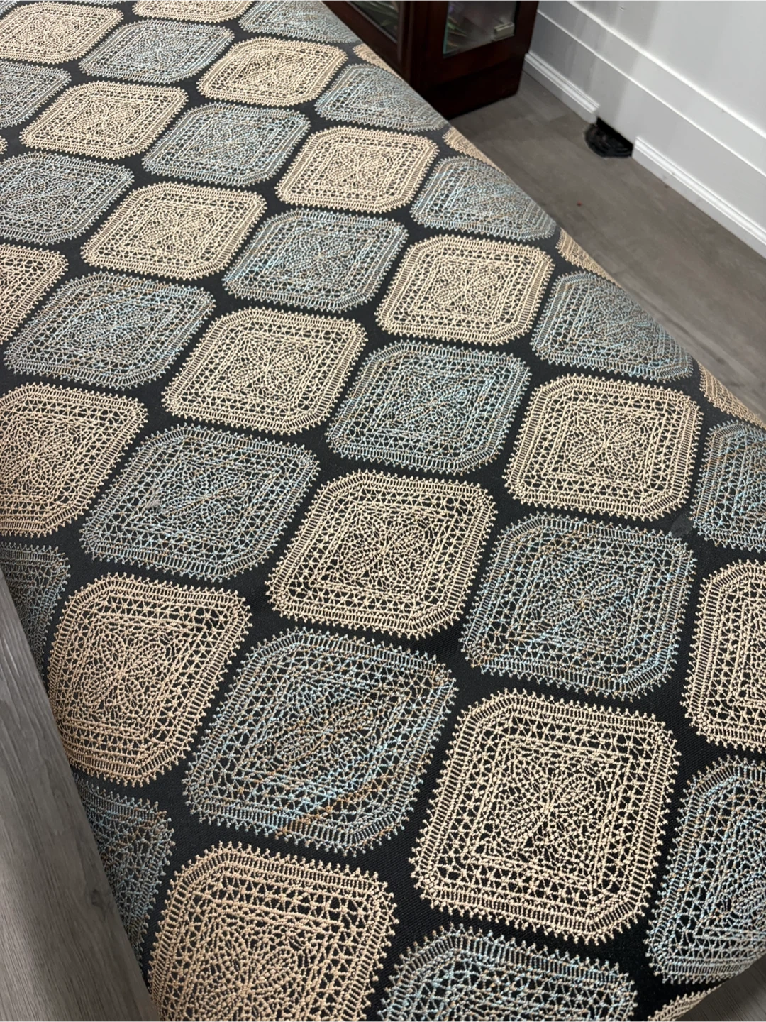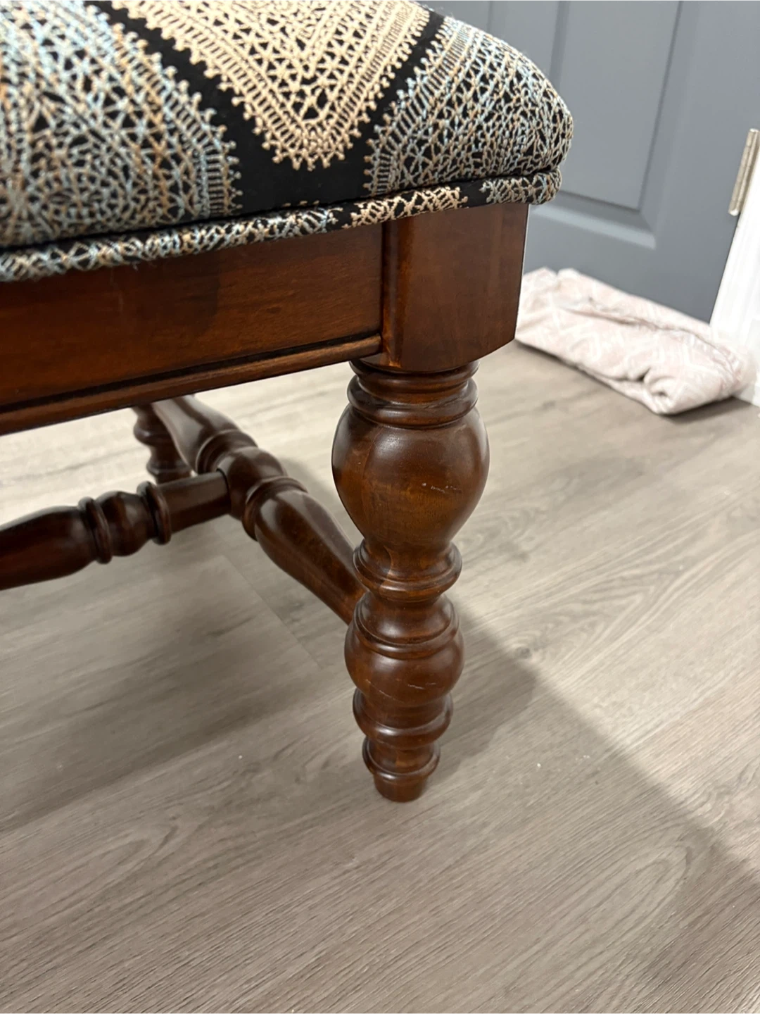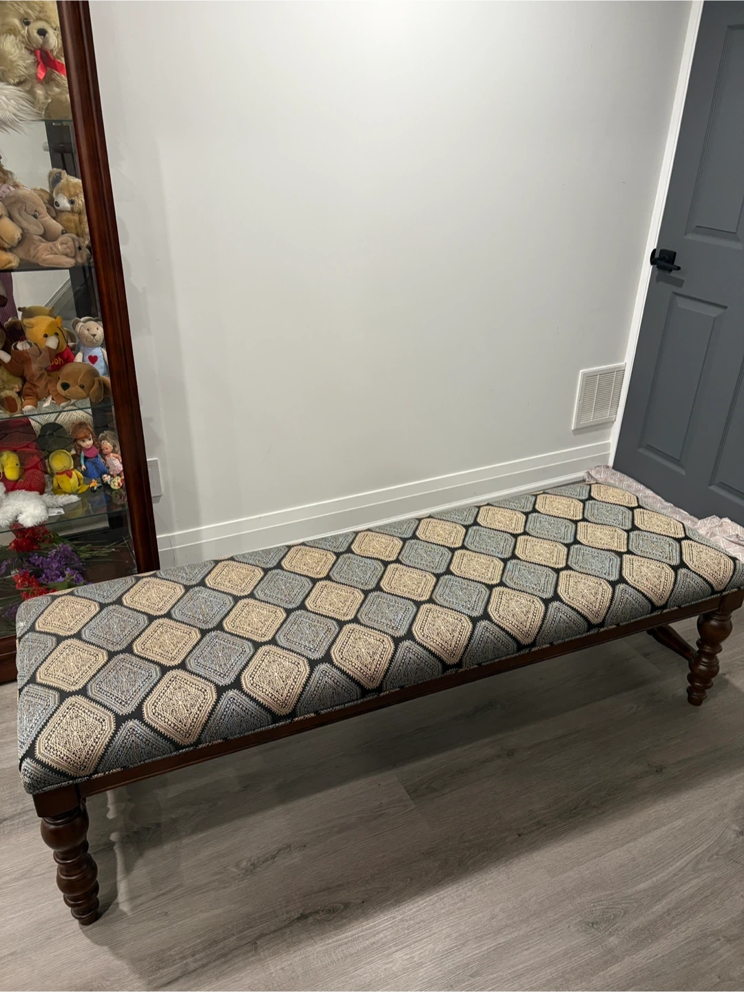 Here's a lovely upholstered bench with a unique patterned design! The legs are made of wood, and the upholstery features a detailed geometric pattern in neutral tones. It would make a great addition to an entryway or living room to add some extra seating