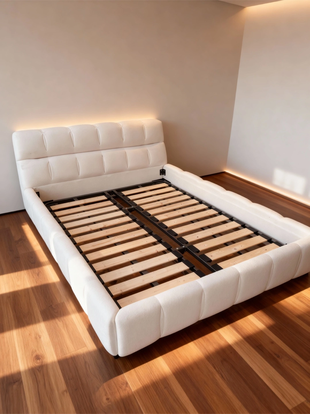 33Selling a queen-size upholstered platform bed frame in excellent condition! It features a stylish design and sturdy construction. Perfect for adding a touch of elegance to your bedroom. The bed frame is a beautiful off-white colour.
