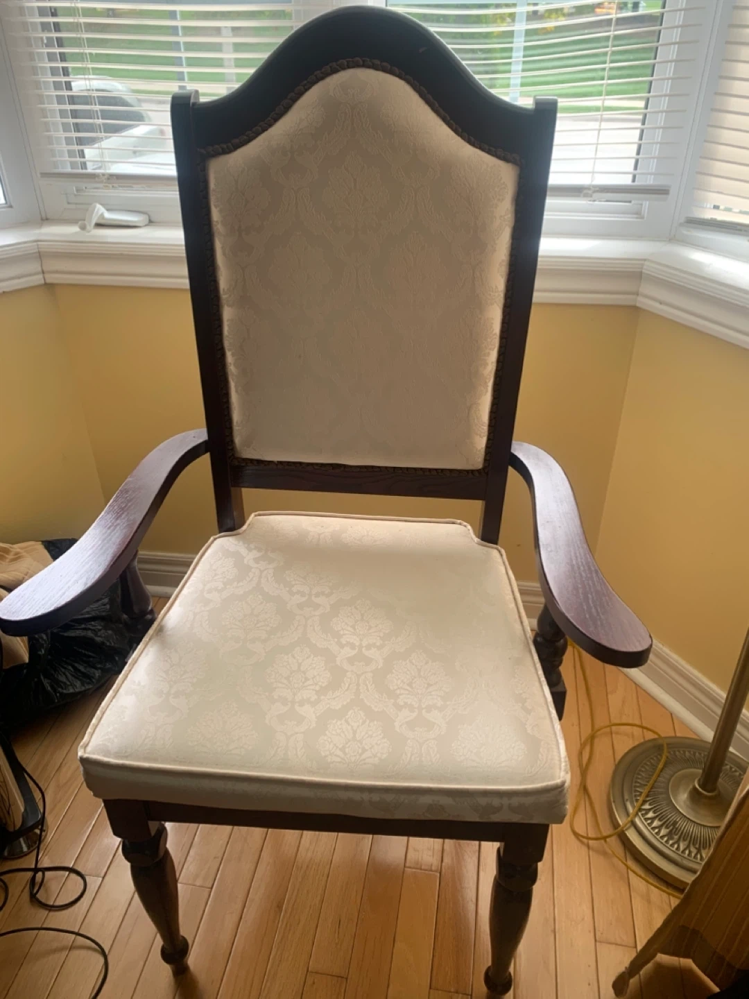0Selling a lovely upholstered armchair. It features a cream-coloured patterned fabric and a dark brown wooden frame. It's in great condition and would be a nice addition to any room!