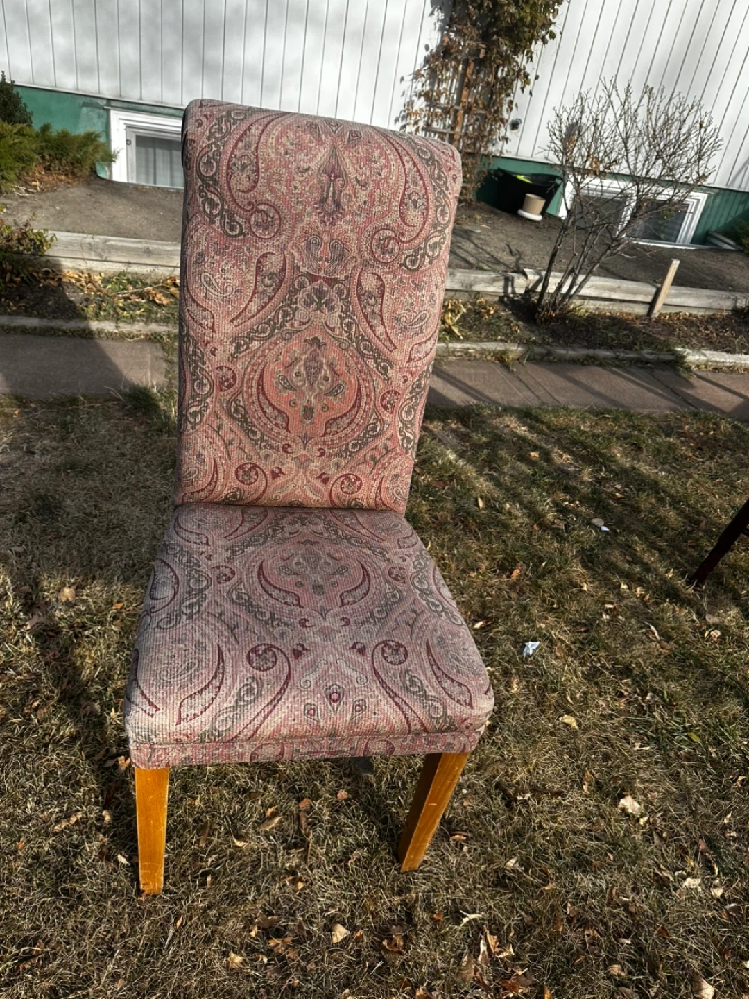 28Selling a wood chair with a unique paisley pattern upholstery. 41 inch high back. The chair has wooden legs and a high back. It's in good condition to use for the study room, living room. But the original color is not new if you don’t mind.