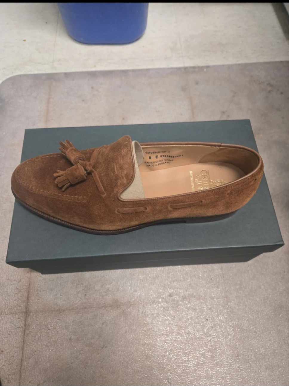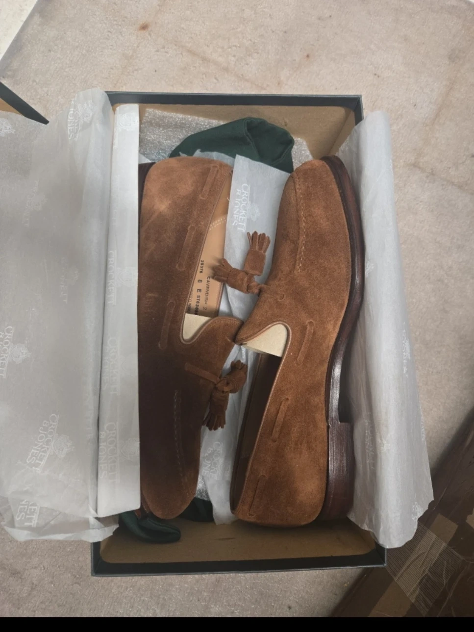 These are Crockett & Jones Cavendish 2 loafers. They're made of polo brown calf suede with leather soles. Includes original box.