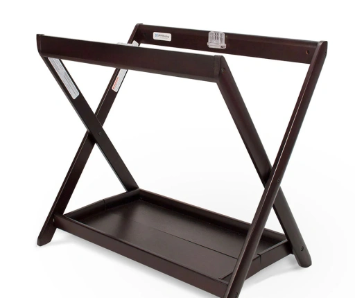 Espresso-coloured Bassinet stand with bottom shelf. can fold easily for transport. 2016 model