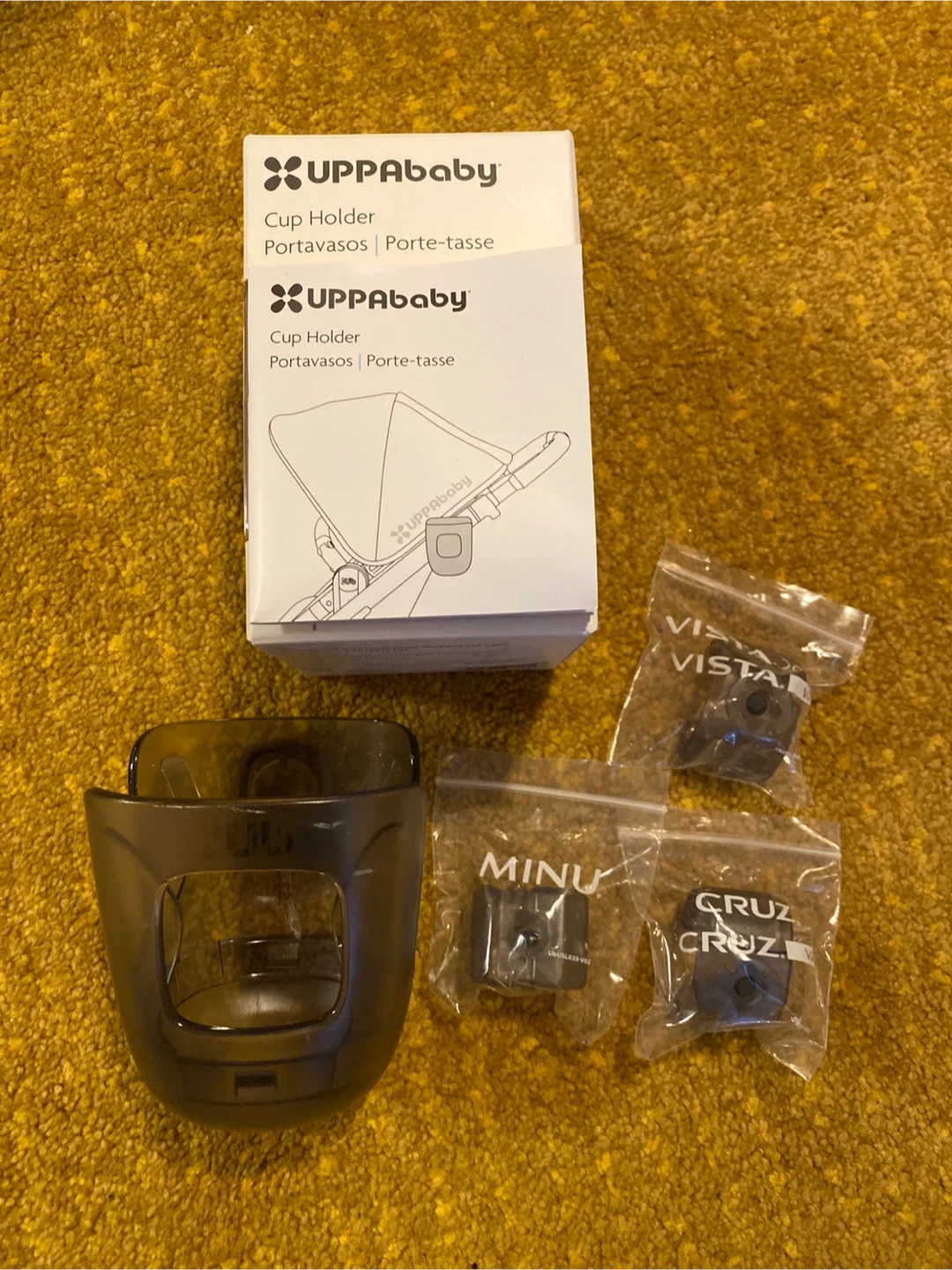 Selling an UPPAbaby cup holder, compatible with Vista, Cruz, and Minu strollers! It's in great condition and ready to use. Includes the necessary adapters for each stroller model, all in their original packaging.