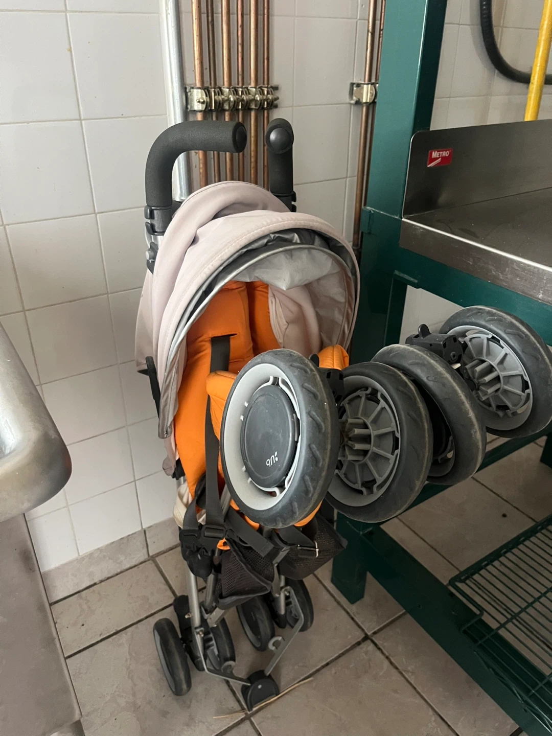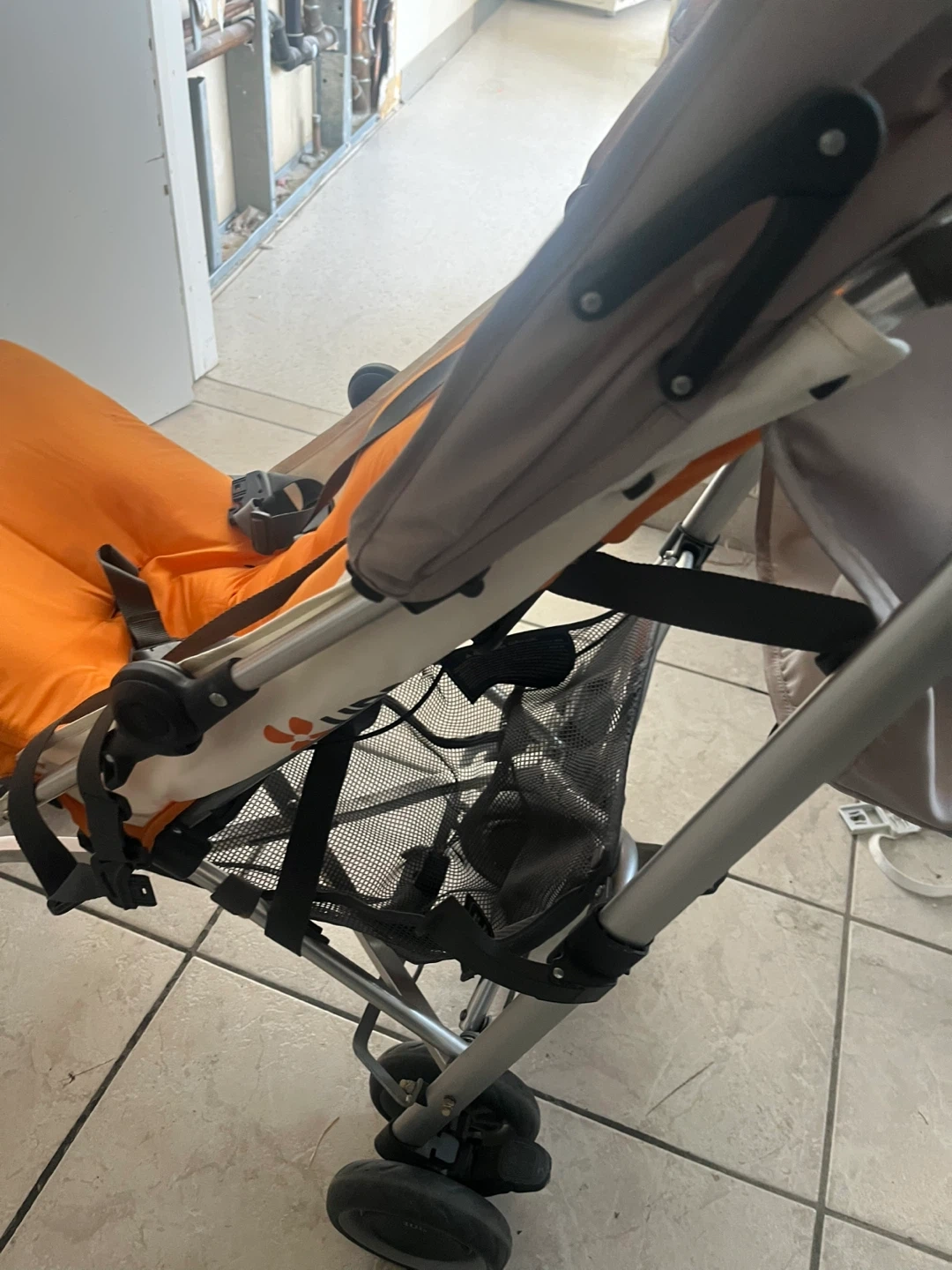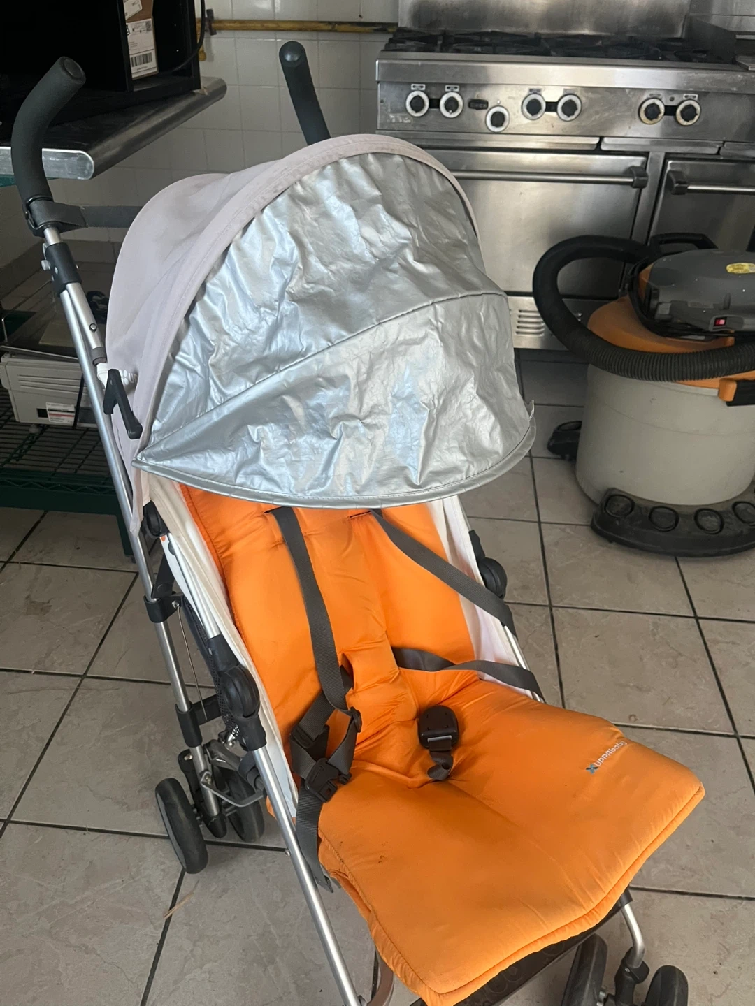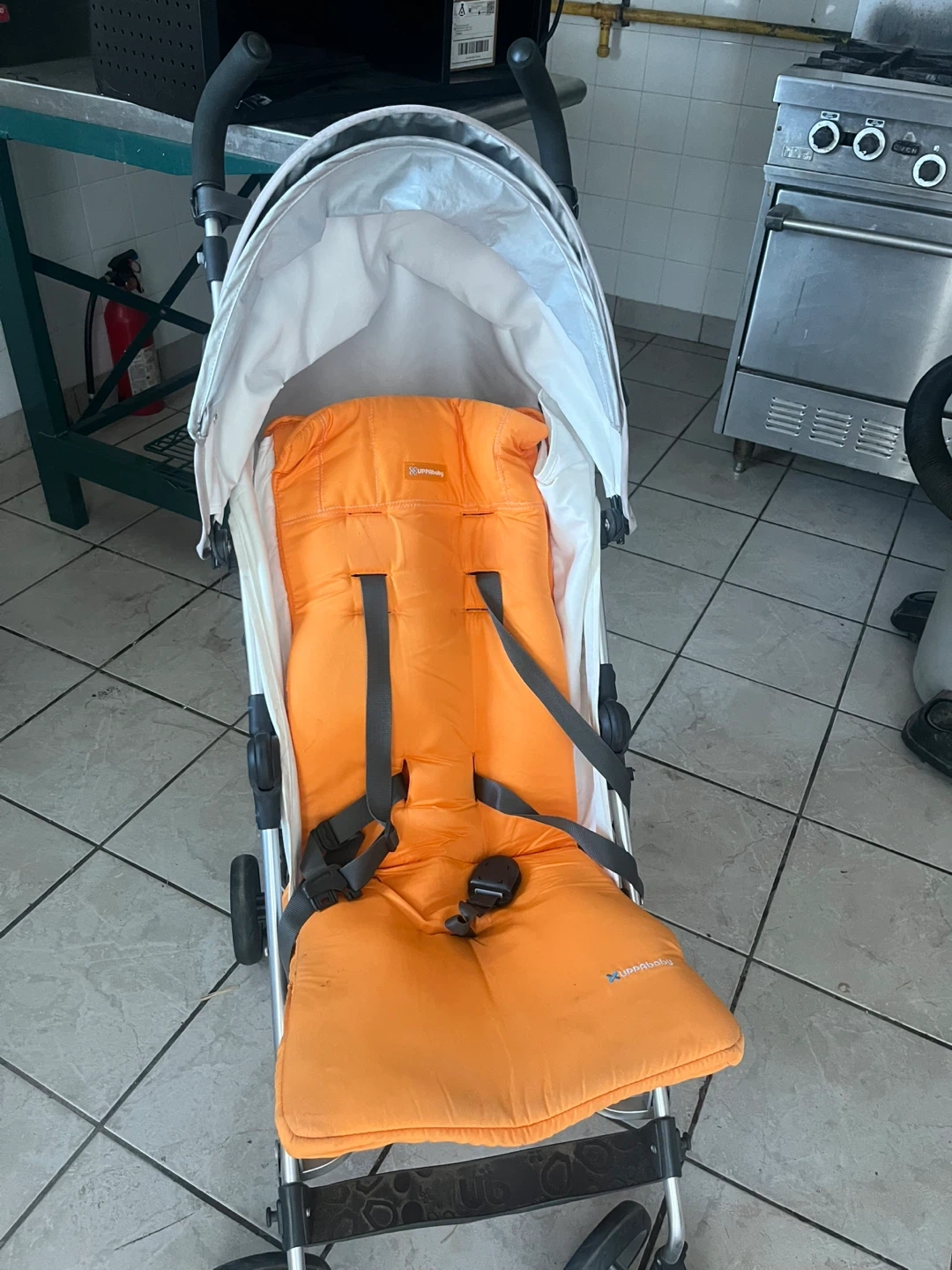 Selling an UppaBaby G-Luxe stroller. It features a silver frame with an orange seat and canopy. Perfect for navigating city streets or parks with your little one!