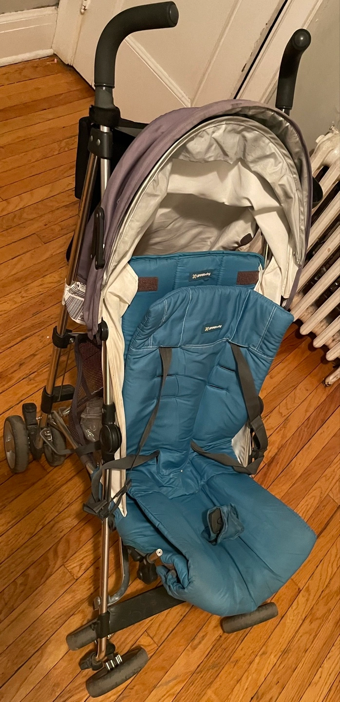 Lightweight stroller, teal blue fabric, silver frame. Includes small storage basket underneath.