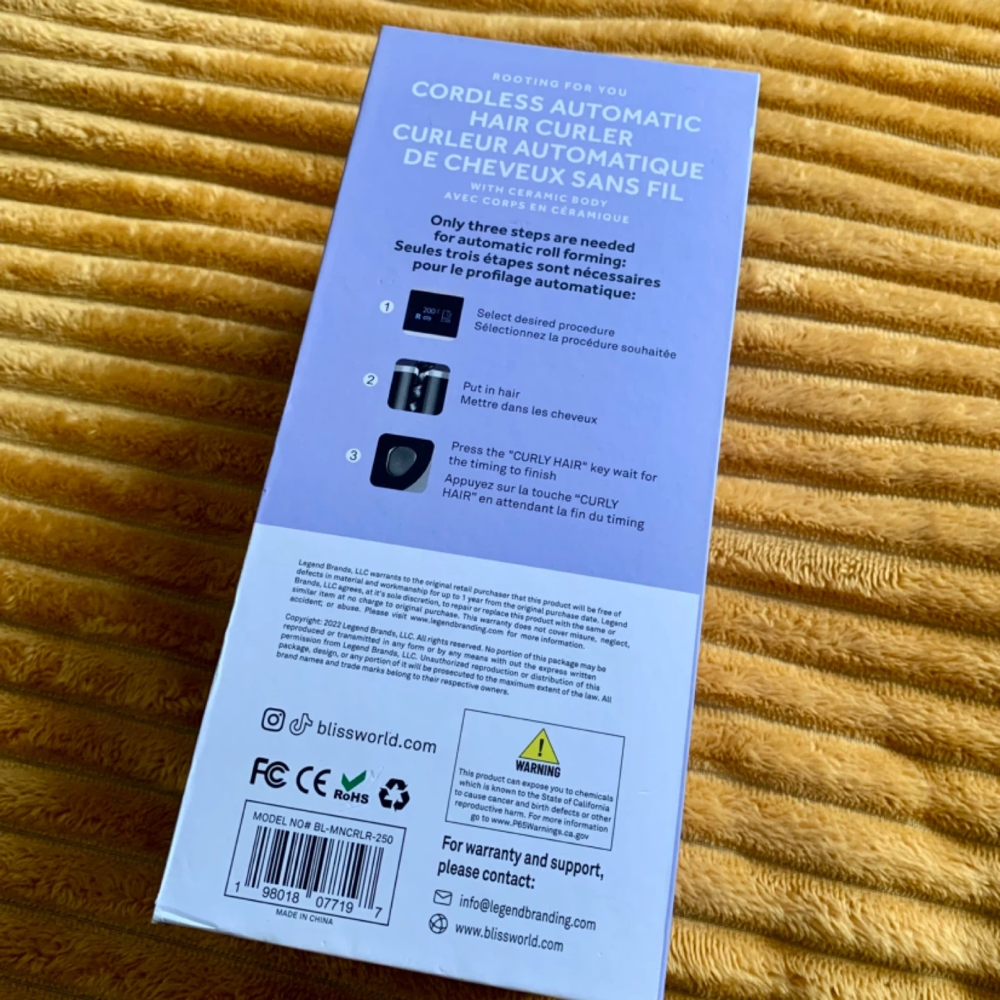This is a cordless automatic hair curler by Bliss. It features USB charging and offers 60 minutes of usage time. The device allows for choice in curling direction and has an anti-scalding design.