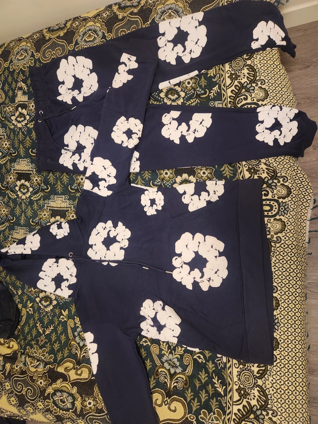This is a navy blue hoodie and sweatpants set from Denim Tears. It features a white floral pattern all over the garments. The set is made in Portugal. Made for comfy streetwear!