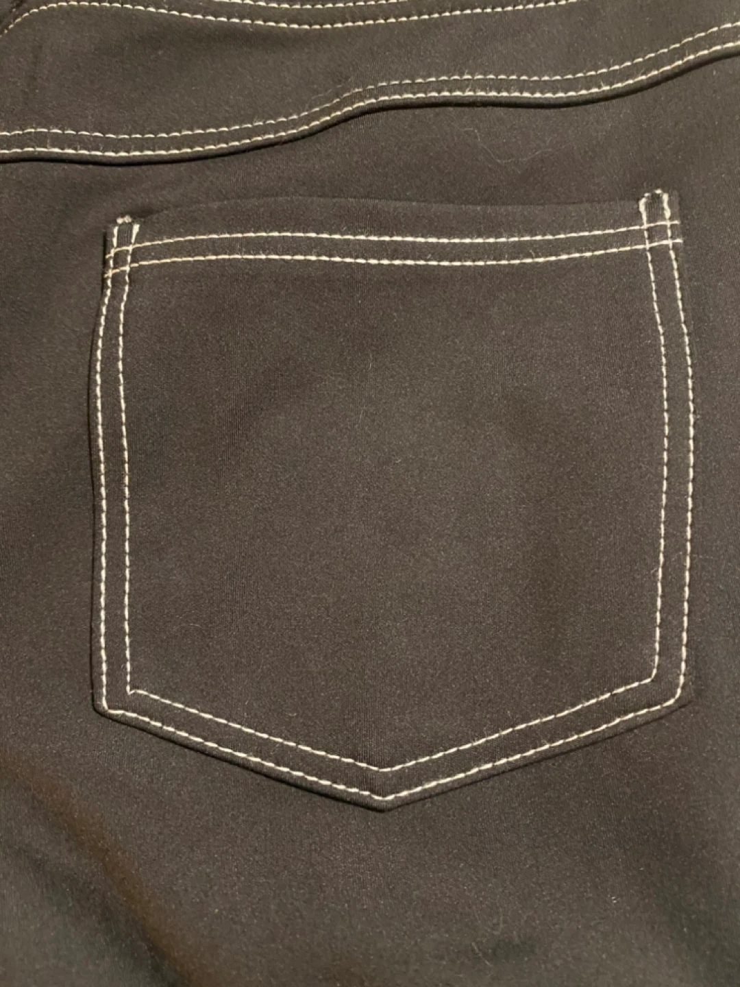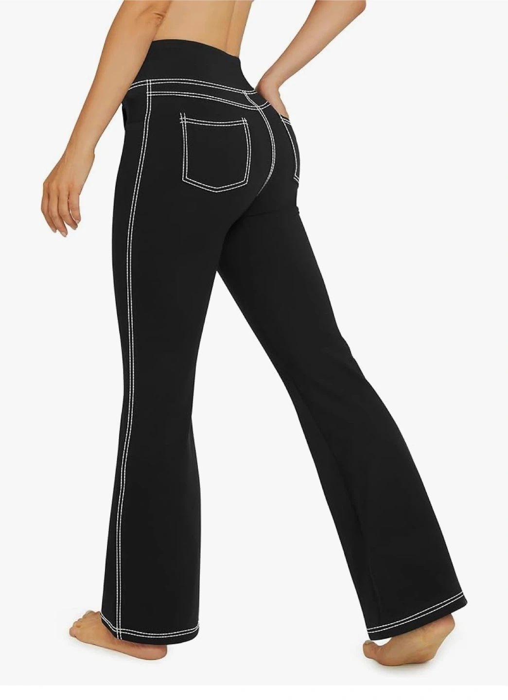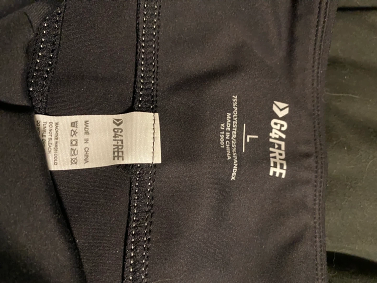 These G4Free flare leggings are black and size large. They're made of 75% polyester and 25% spandex. The contrast stitching adds a nice touch.