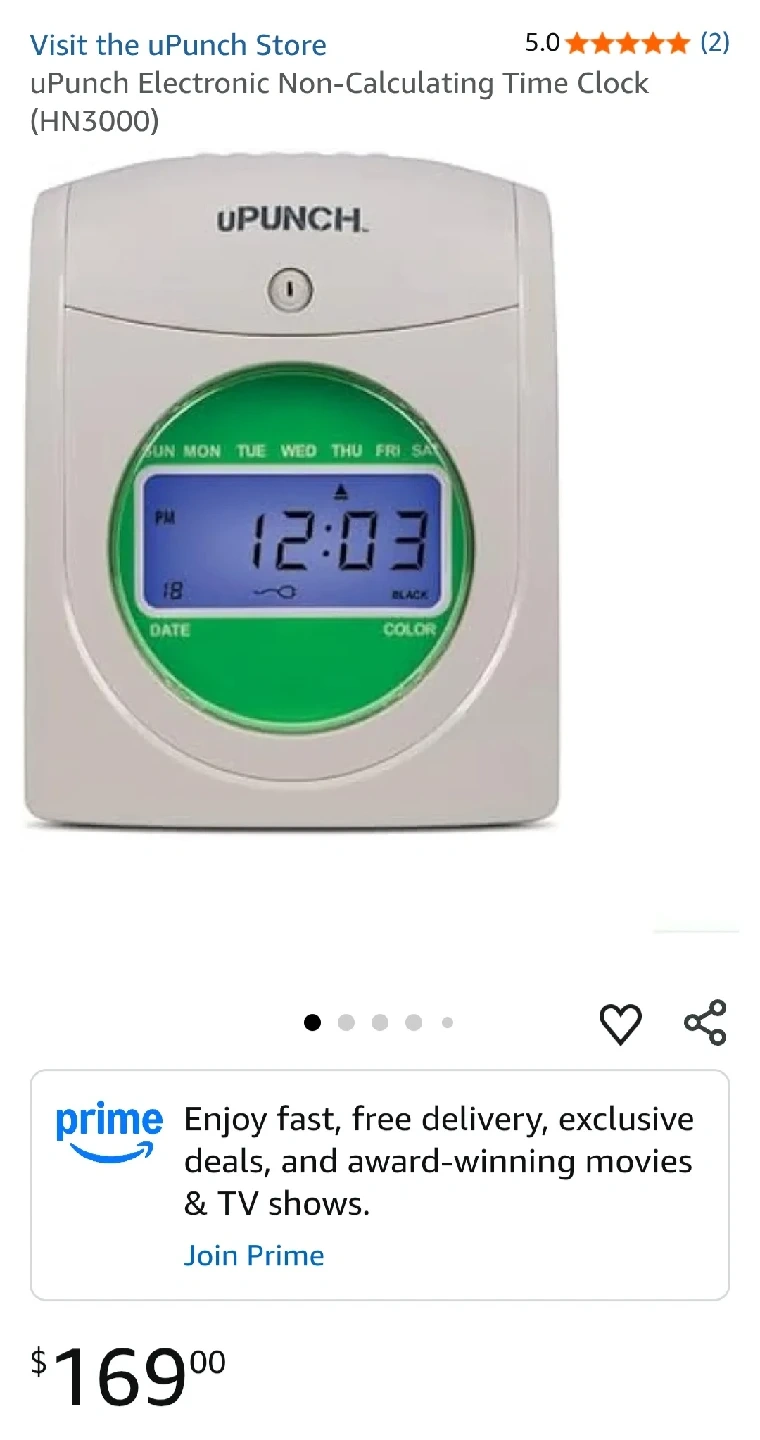 328Retails for $169 on Amazon! https://www.amazon.ca/uPunch-Electronic-Non-Calculating-Clock-HN3000/dp/B0C1PT9L21 I'm selling a new UPunch HN3000 time clock, perfect for accurately tracking employee hours with its digital display and easy-to-use interface. Key features include: * Digital time display * Automatic card feed * Easy to program * Includes time cards and ribbon I estimate that this clock would sell for around $150 - $250. If the ad is up, the item is available, so no need to ask! Get ready to punch in those hours with style! SKU SHELF766-629