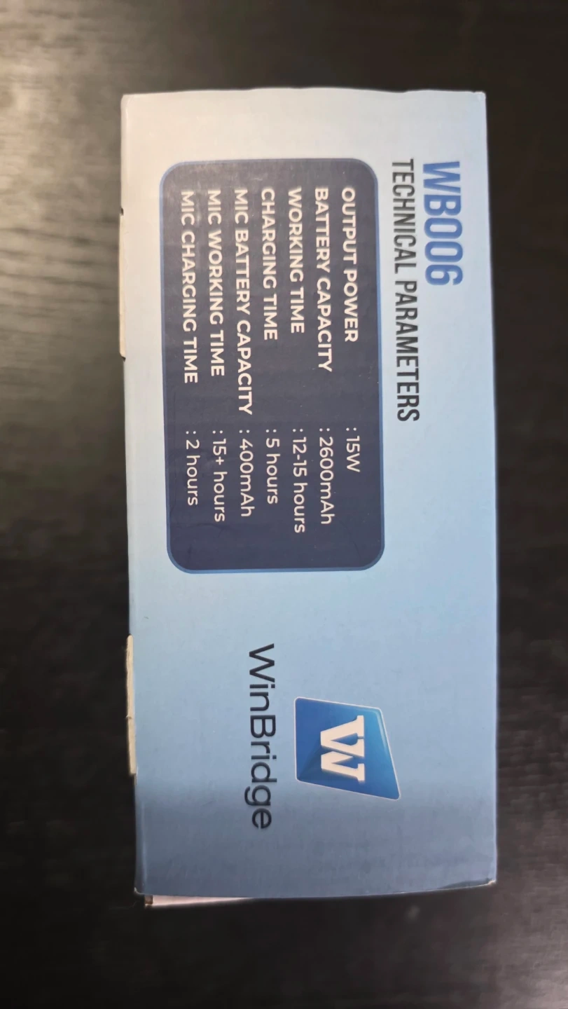 This is a WinBridge WB006 wireless lavalier voice amplifier system. It's 2.4G wireless with a rechargeable battery. The amplifier has a 2600mAh battery capacity, offering 12-15 hours of working time.