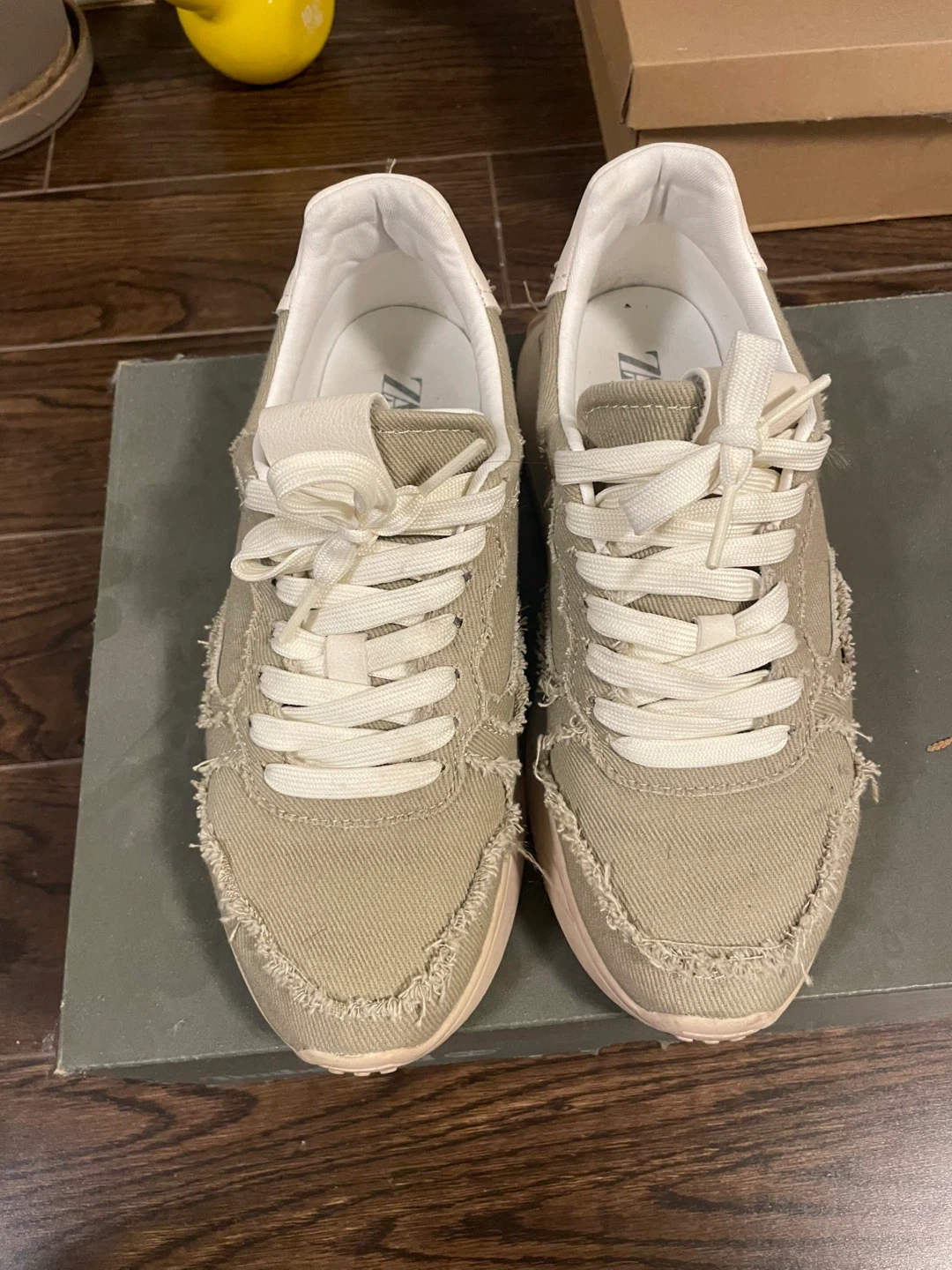 ZARA women's canvas sneakers in a neutral khaki colour. These shoes are a European size 38. They feature a distressed, frayed hem design along the edges. Perfect for casual everyday wear!