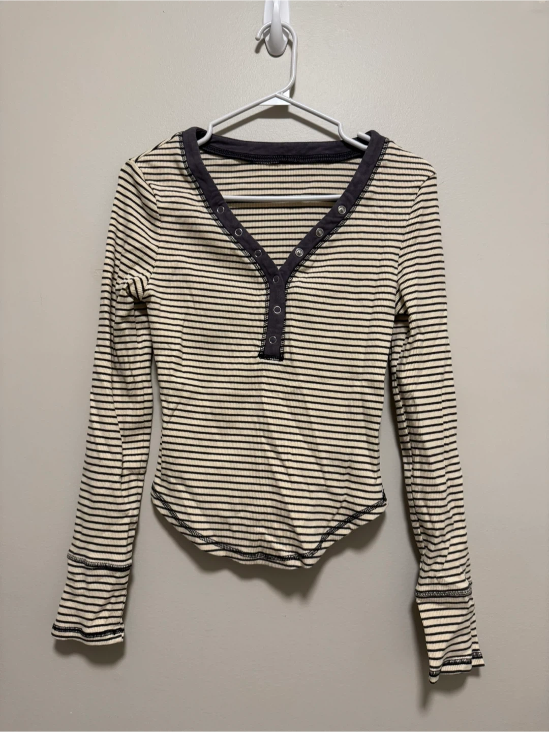 Here's a long sleeve top with a striped pattern! It features a v-neck with button details. Perfect for layering or wearing on its own