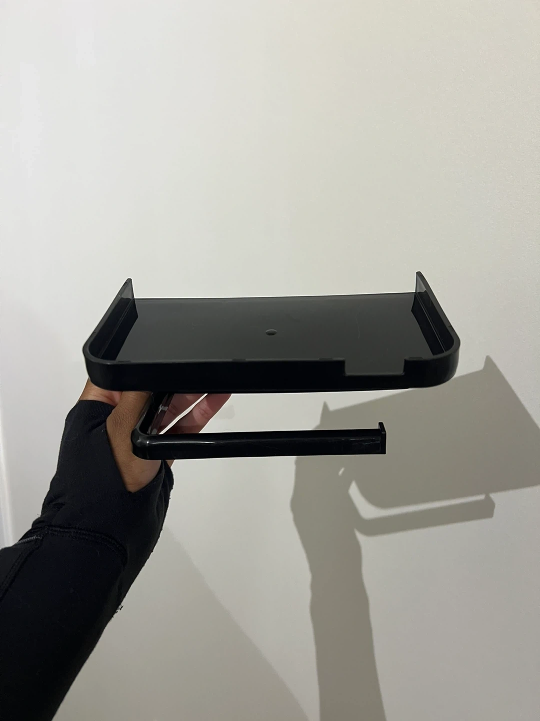 Selling a black plastic toilet paper holder with shelf for phone, hygiene products, sir whatever your heart desires. It's brand new in box and ready for a new home!
