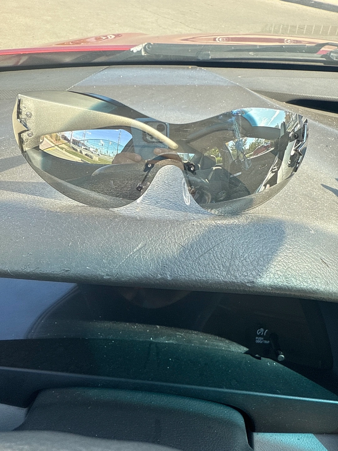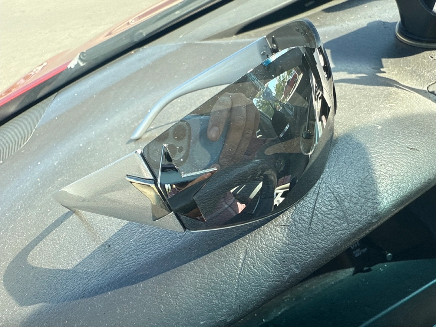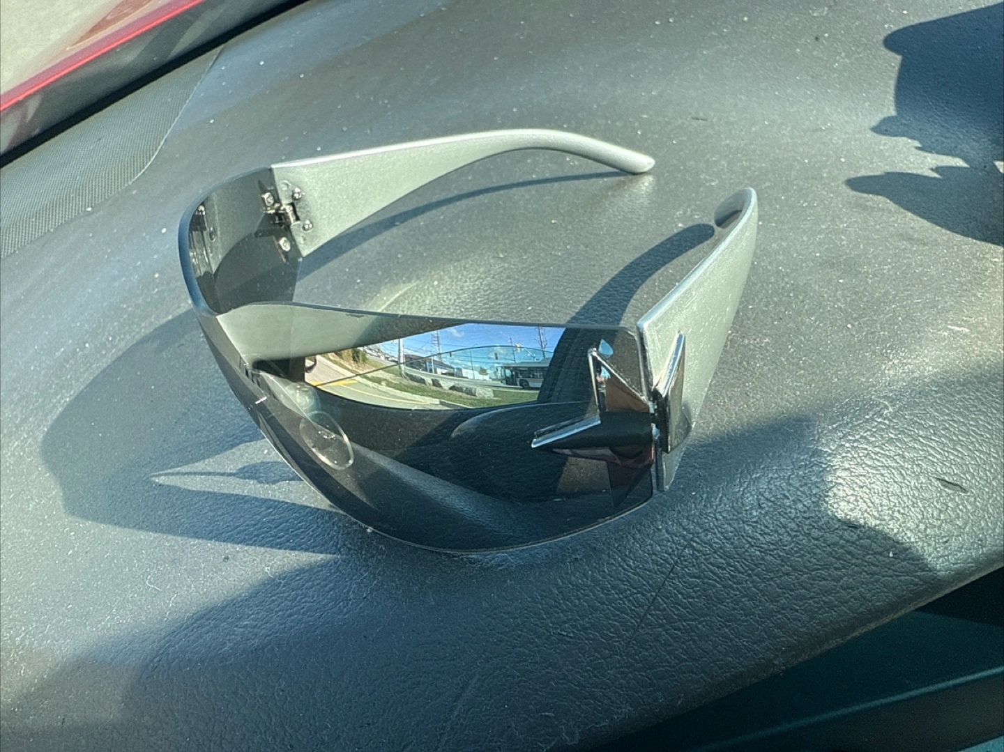 Selling a pair of silver shield sunglasses. They feature a unique star detail on the sides. These sunglasses are in good condition and ready for a new home!