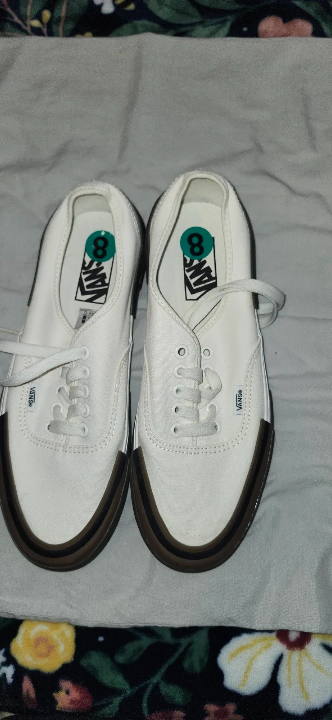 These are white Vans Authentic shoes with a size 8 tag visible. They feature a classic Vans waffle sole and rubber toe cap. Great for everyday wear!