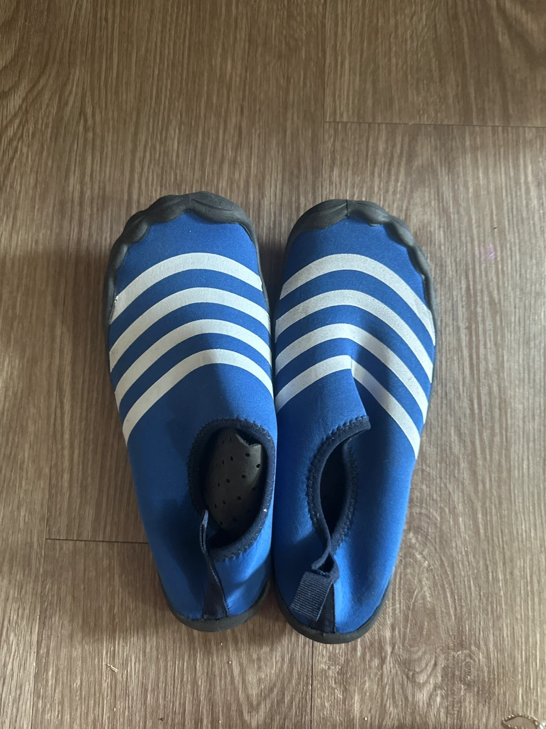 Blue water shoes with white stripes. They feature a flexible rubber sole and a pull tab for easy on and off. The breathable material is quick-drying. These shoes are great for the beach or pool!