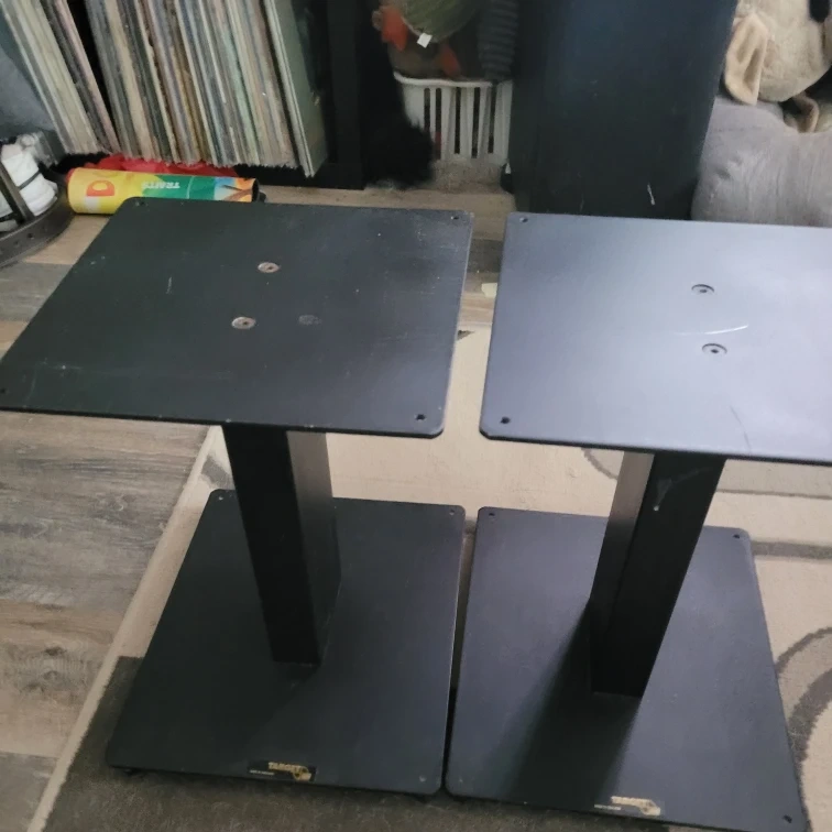 Pair of black speaker stands made by Target Audio Products. These sturdy stands are made in England and would be useful for elevating your bookshelf speakers. They're black and made of metal.featuring a fixed height 300 mm/ 12 inch. It's a very heavy stand with 9.8 by 12 base and 9.5 top.