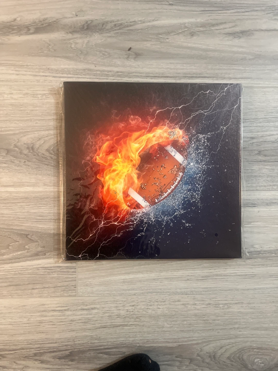 This canvas art print features a dynamic image of a football engulfed in flames and splashing water. It's a striking piece for any sports enthusiast's decor. The print comes ready to hang.