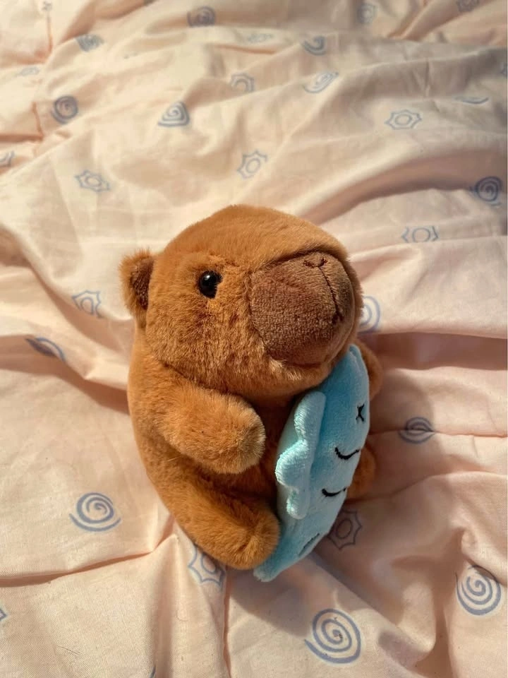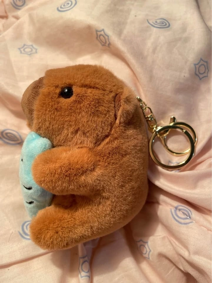 Adorable capybara plush keychain holding a little blue fish. Soft, squishy, and full of cuteness! Perfect for bags, backpacks, keys, or as a cute desk or shelf accessory.
