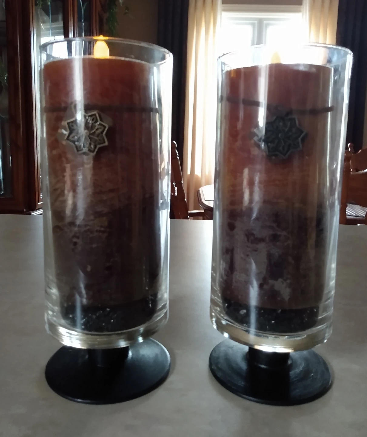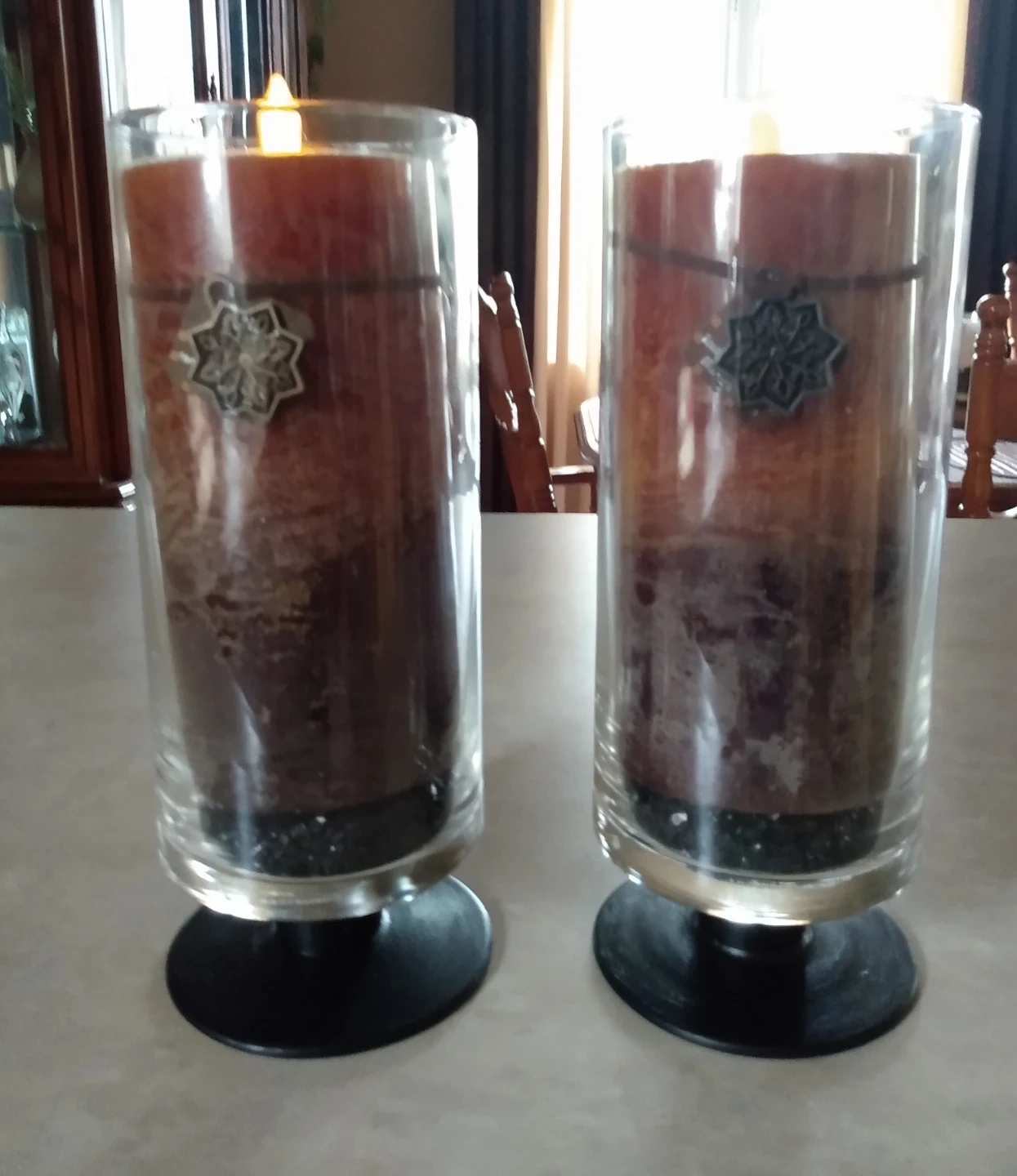 A pair of clear glass hurricane candle holders. Each features a blacknbase and is filled with dark decorative stones. Great for setting a cozy mood!