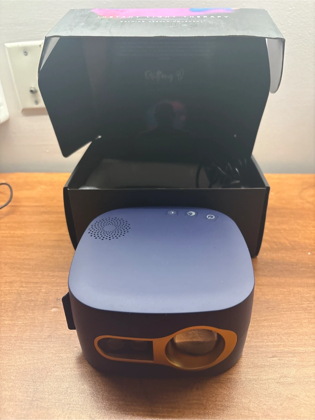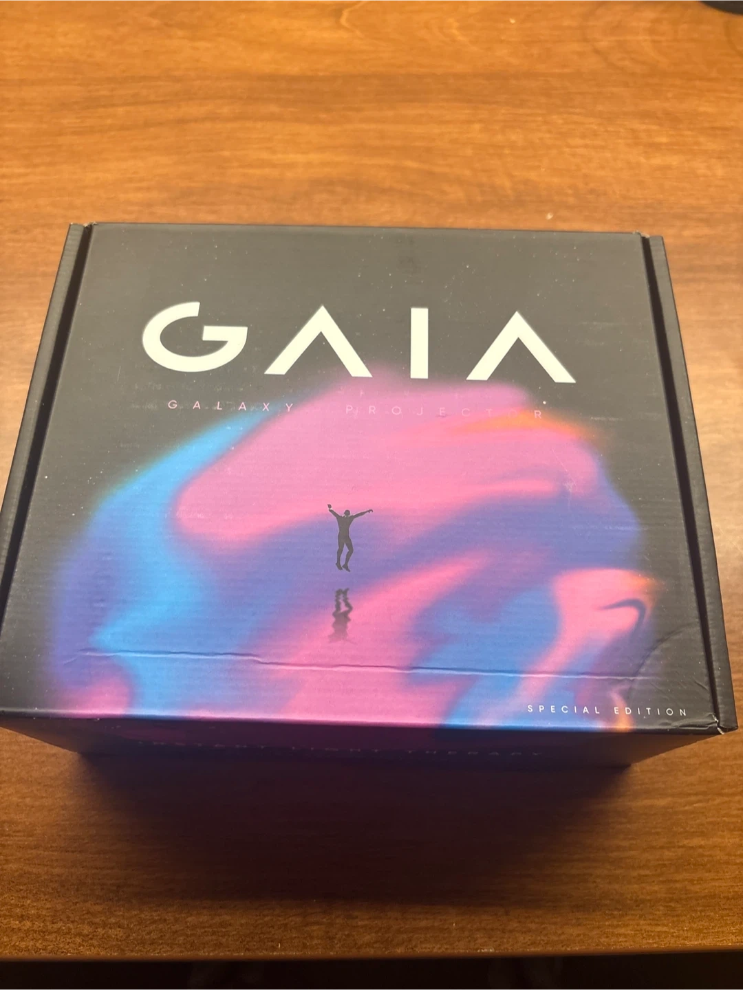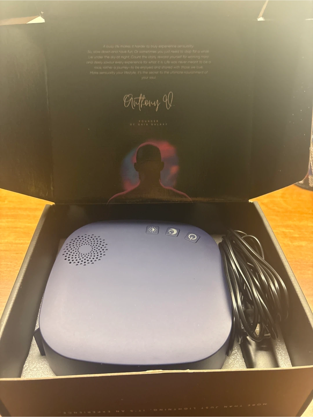 This is a Gaia Galaxy Projector, Special Edition. It's a nebula light therapy device. The projector has multiple settings and comes with its original box.