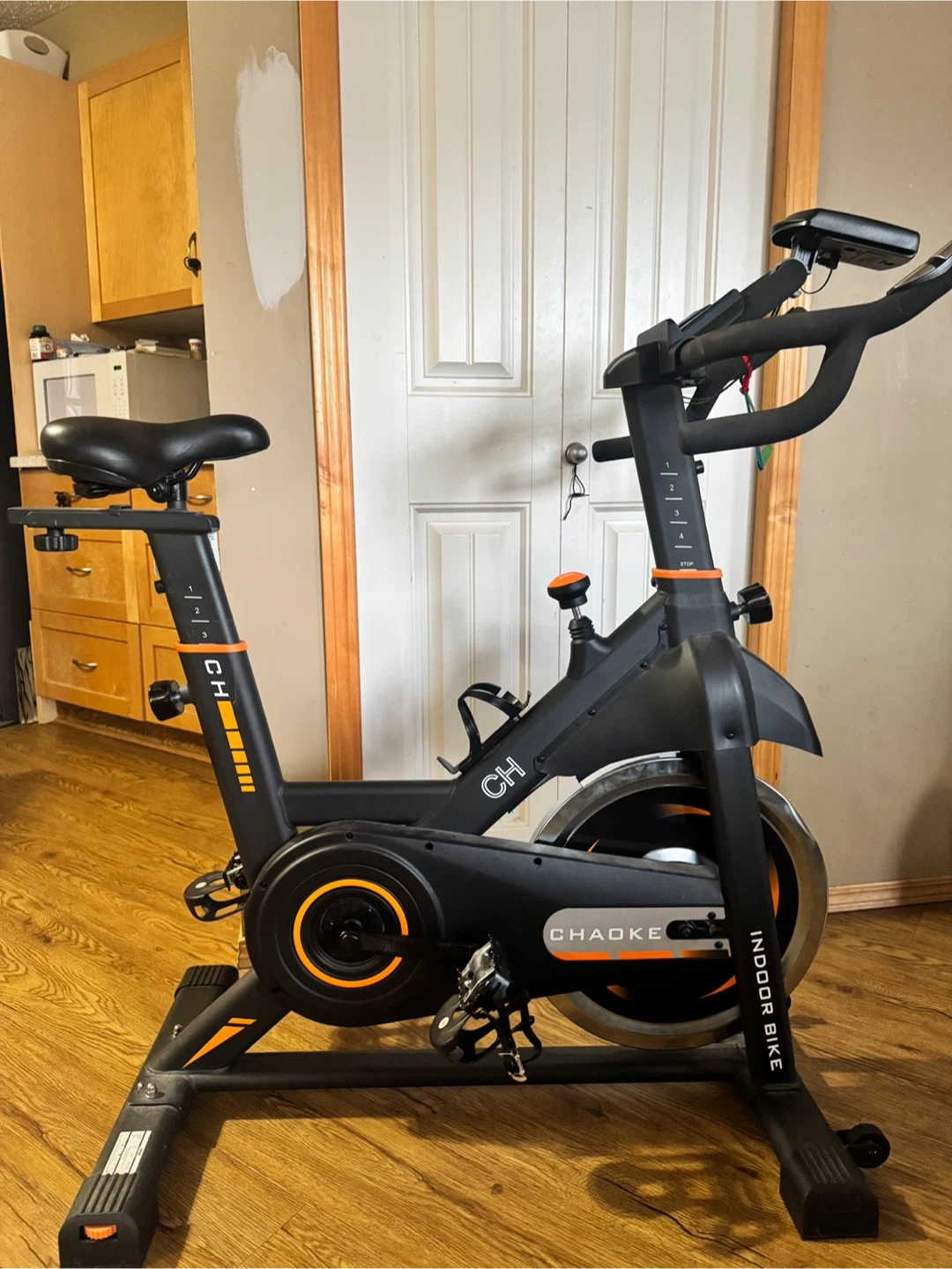 Chadke indoor spin bike for home workouts. It's black with orange accents. This bike is great for cardio training at home! Not much used and only pick up available.