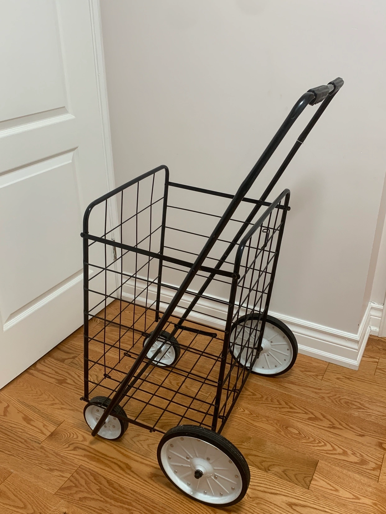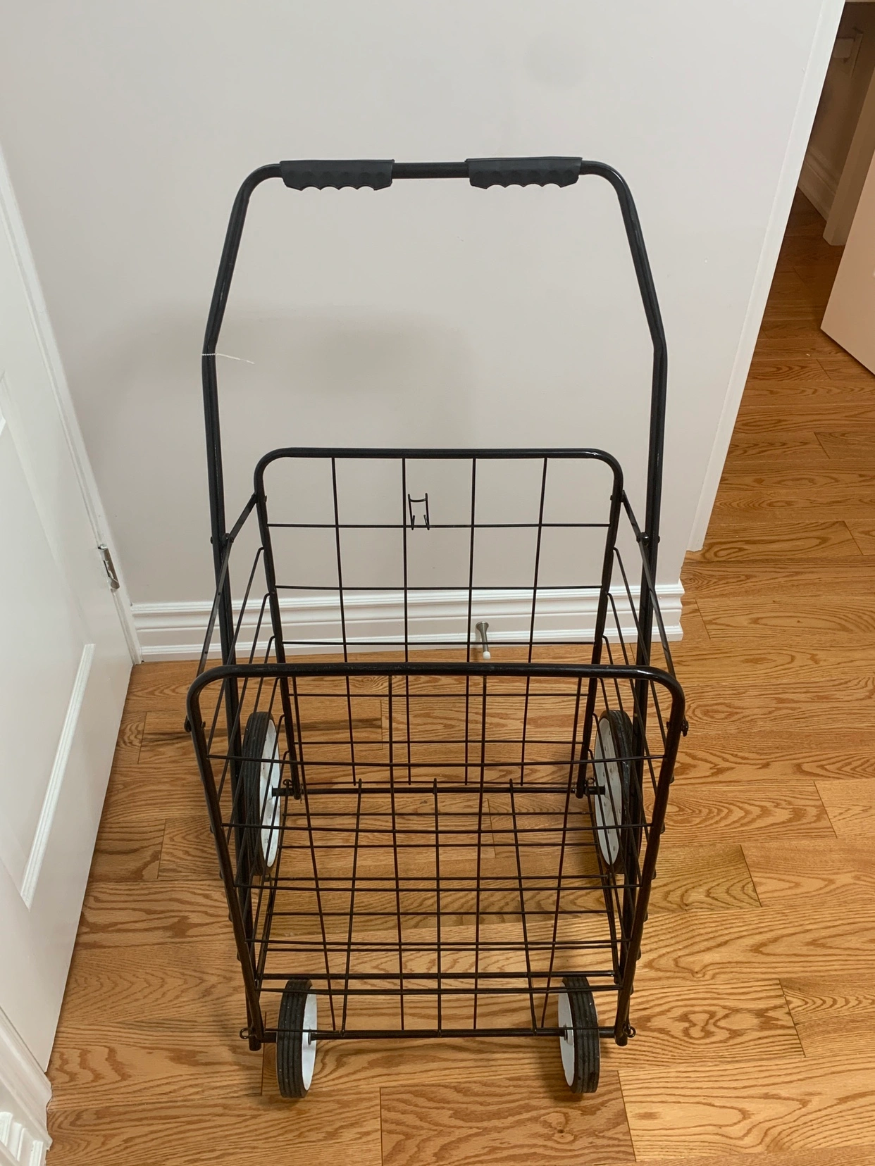 Black metal shopping cart with four wheels and a folding handle. The cart has a wire frame design and is great for groceries, laundry, or other errands.