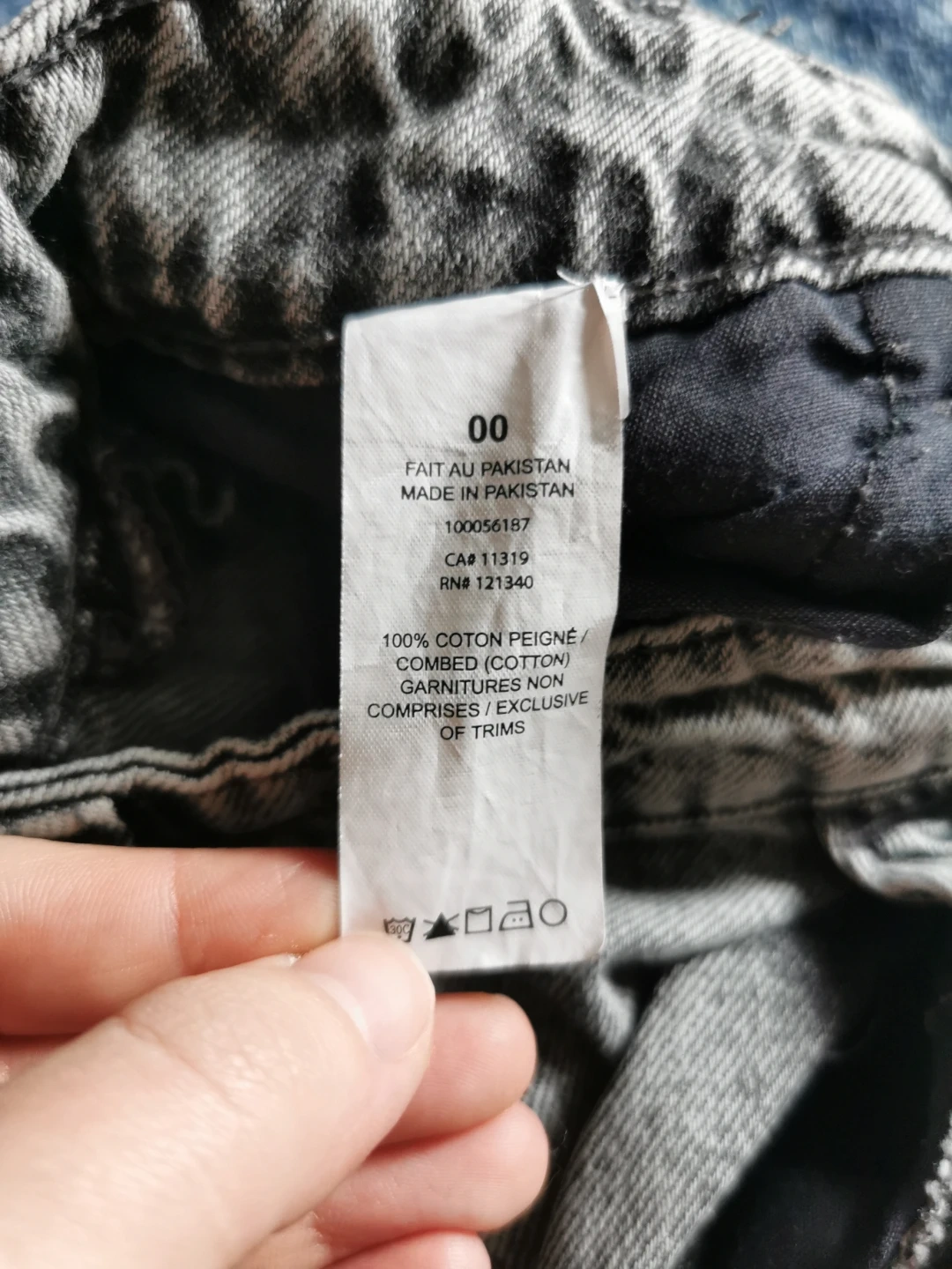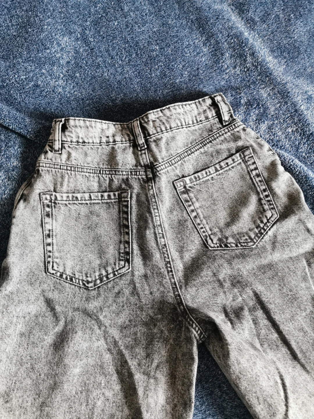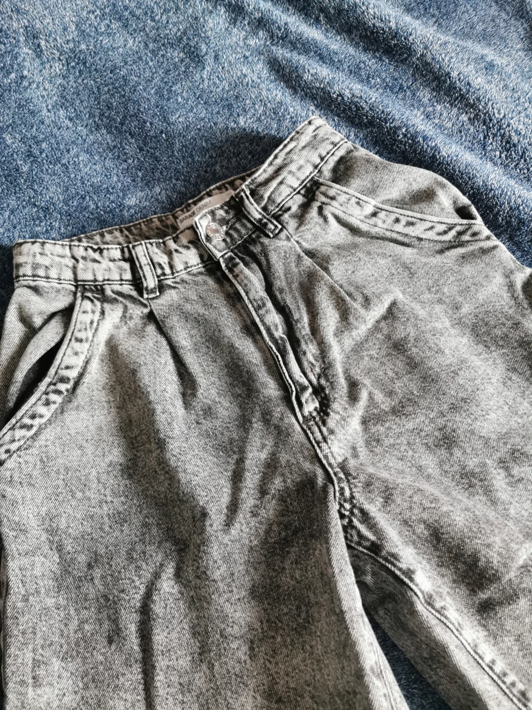 GARAGE DENIM Mom jeans in a grey acid wash. Made with 100% combed cotton. These jeans are a size 00. A classic style for everyday wear!
