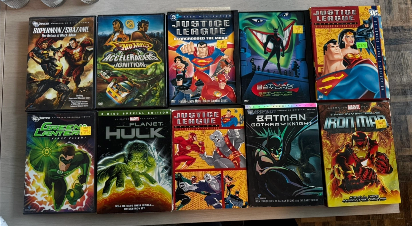 Selling a collection of DC and Marvel animated movie DVDs. Titles include Superman/Shazam, Justice League, Green Lantern, Planet Hulk, Batman Gotham Knight, and Iron Man. Great for any comic book fan!