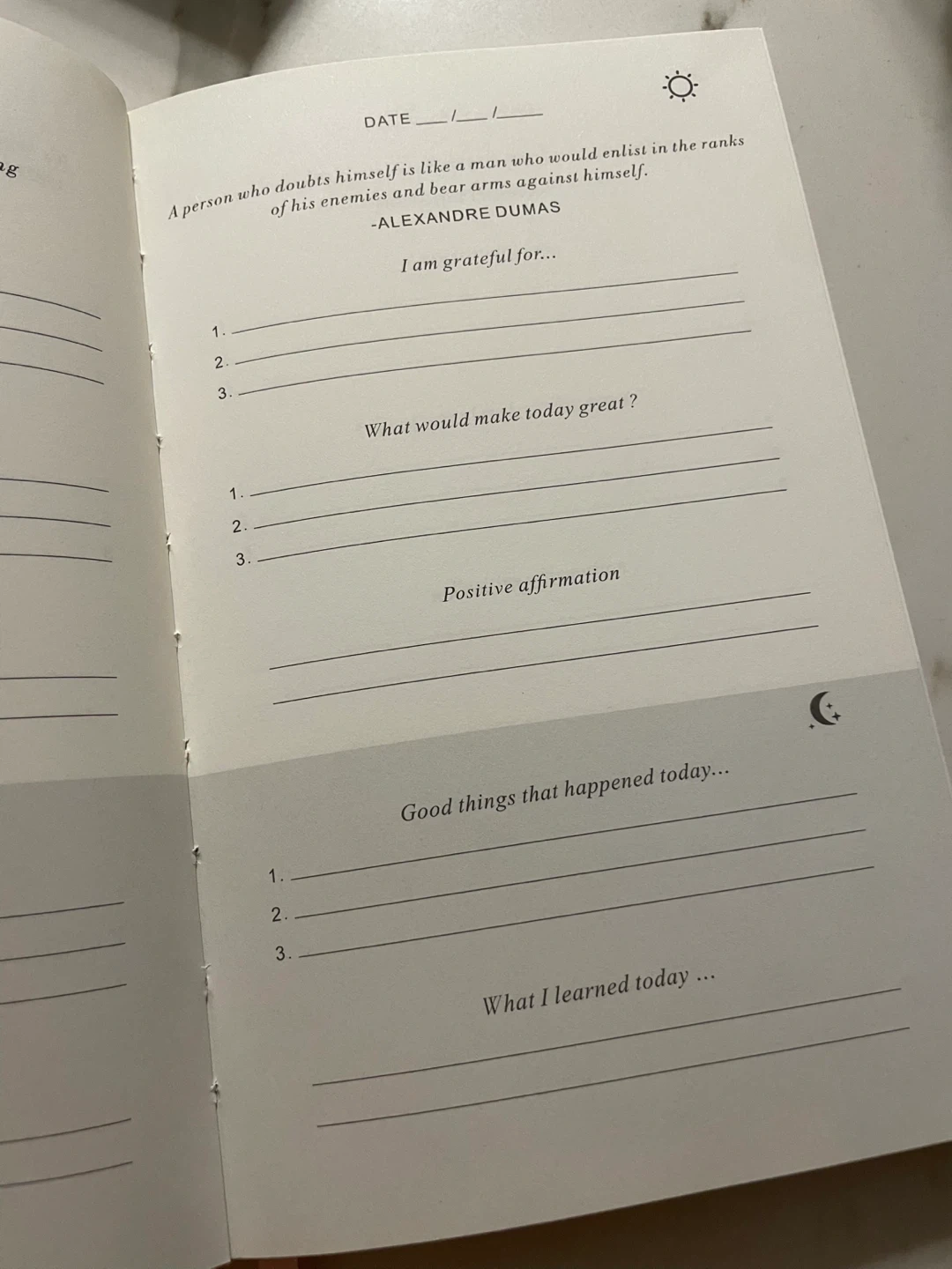 A softcover pink journal designed to help you practice gratitude. It includes prompts for daily reflections and positive affirmations. Paper pages with lined sections for writing.