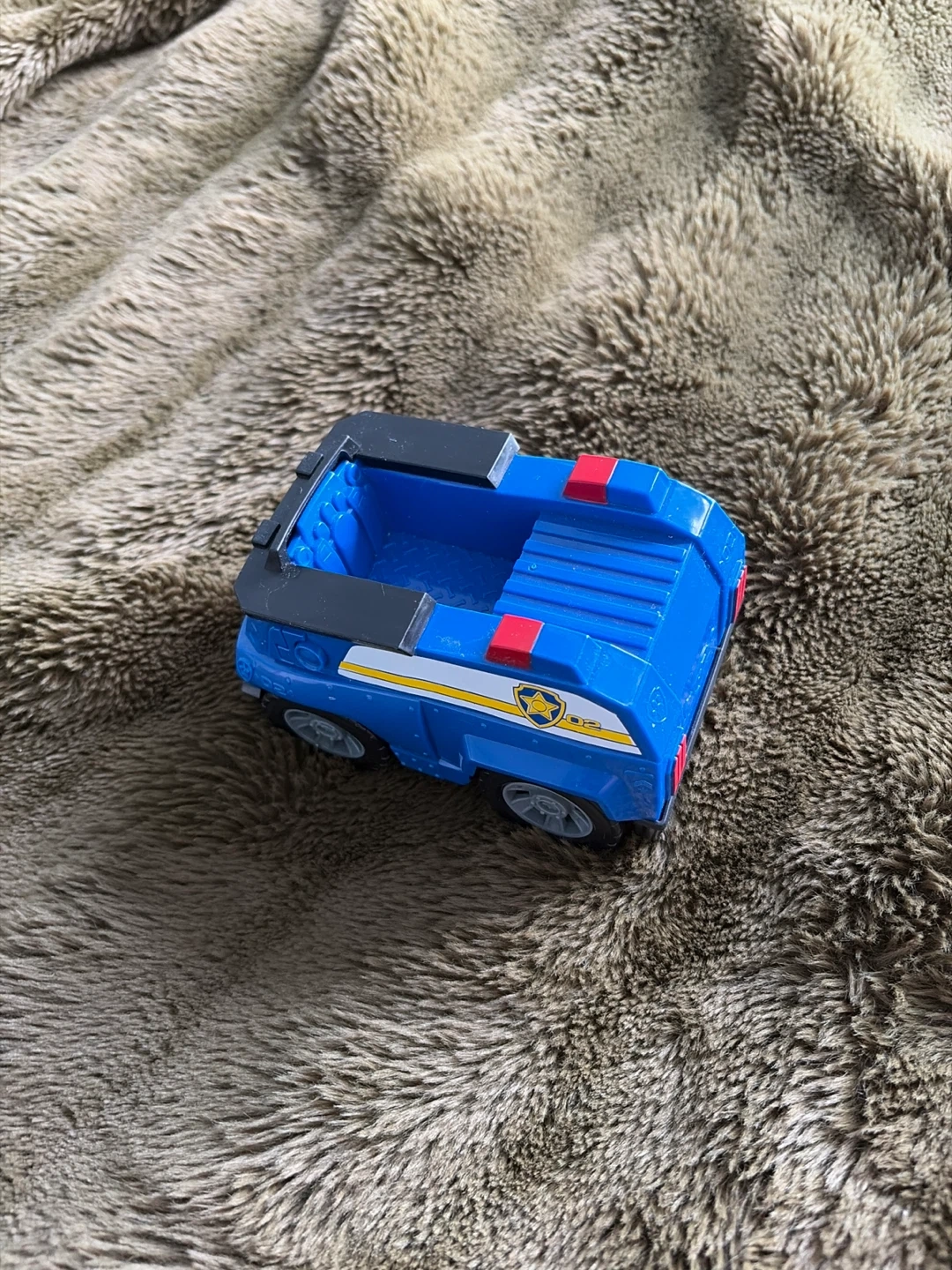 This is a blue toy police cruiser, featuring the Paw Patrol logo. It has grey wheels and black accents on top. It's a fun toy for young fans of the show.
