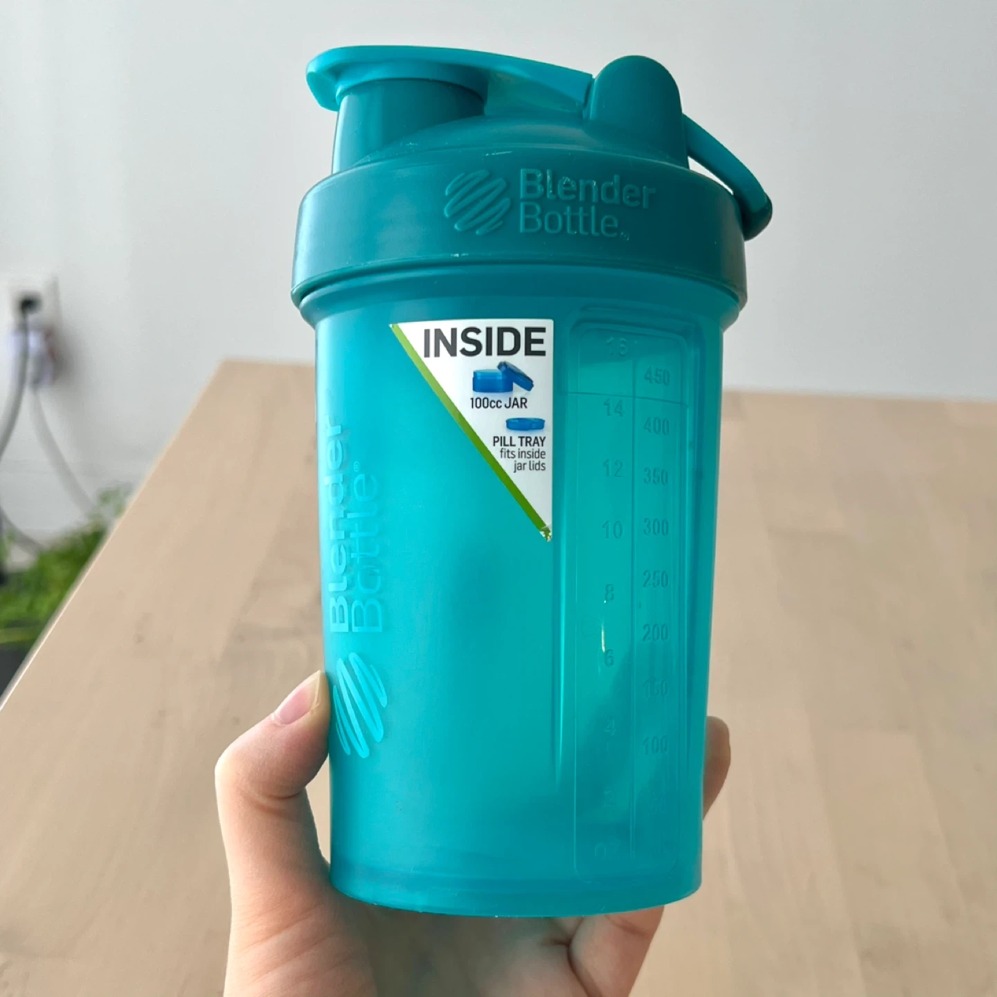 Teal Blender Bottle shaker with a 100cc jar for supplements. It includes a pill tray that fits inside the jar lid.
