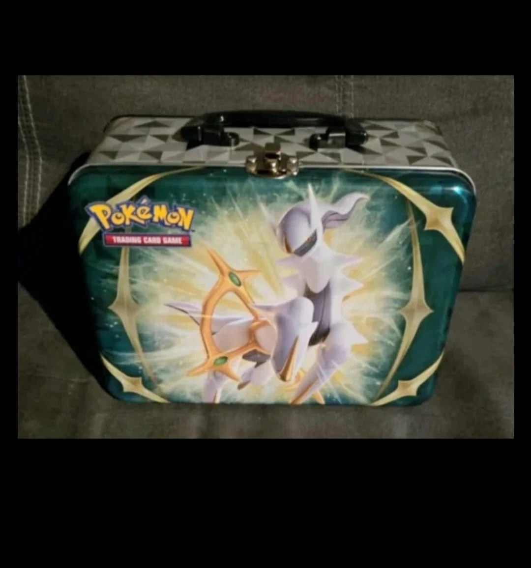 This is a Pokémon Trading Card Game tin box featuring Arceus. It's ideal for storing cards or other small collectibles. The tin has a sturdy handle and clasp closure.