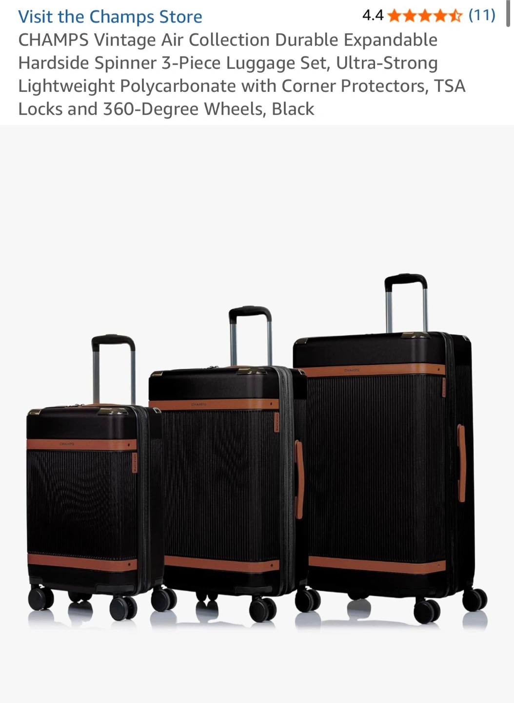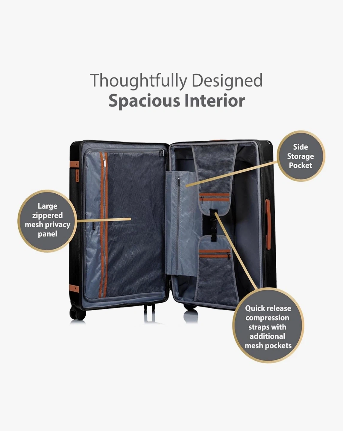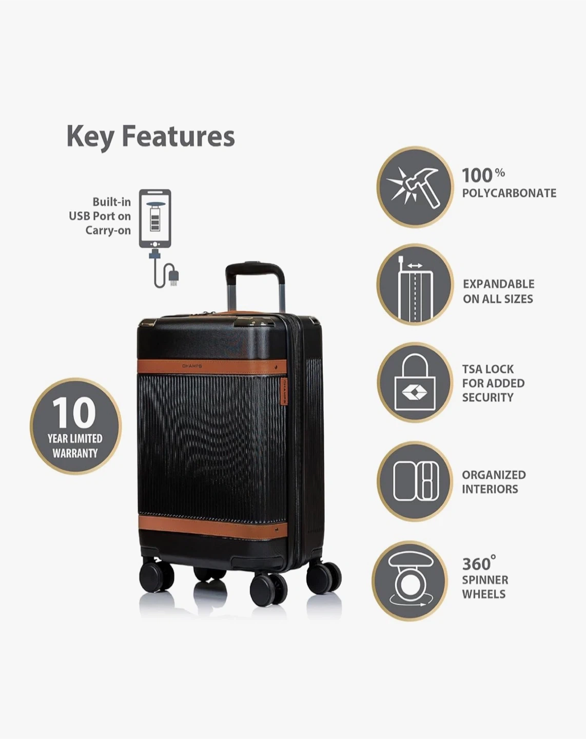 3-Piece Expandable Hardside Spinner Luggage Set – Black with Brown Accents (USB Port)